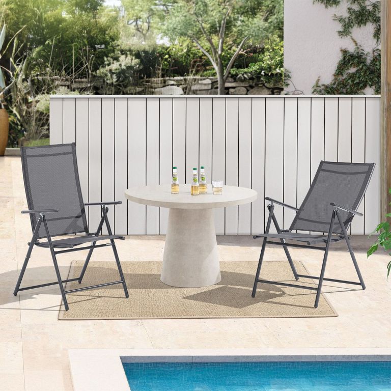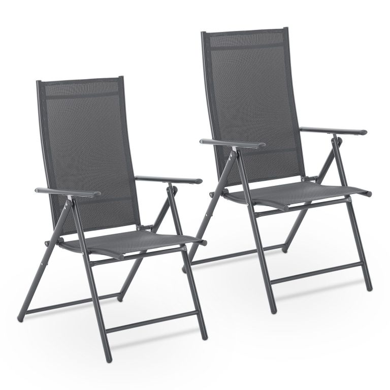 Ciesz się wygodnym siedzeniem w ogrodzie, na tarasie lub podczas biwakowania dzięki zestawowi dwóch składanych krzeseł Calena. Dzięki 7-stopniowemu regulowanemu oparciu łatwo znajdziesz idealną pozycję do relaksu – niezależnie od tego, czy grillujesz latem, czytasz książkę, czy odpoczywasz przy basenie. Nowoczesny antracytowy kolor i elegancki design pasują do każdego przestrzeni na świeżym powietrzu.