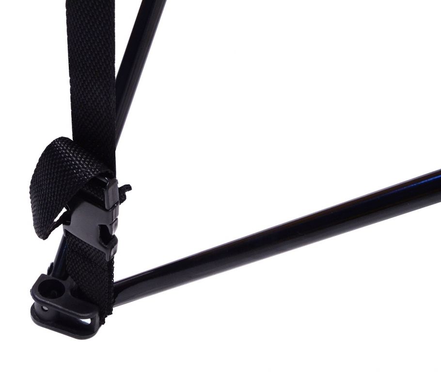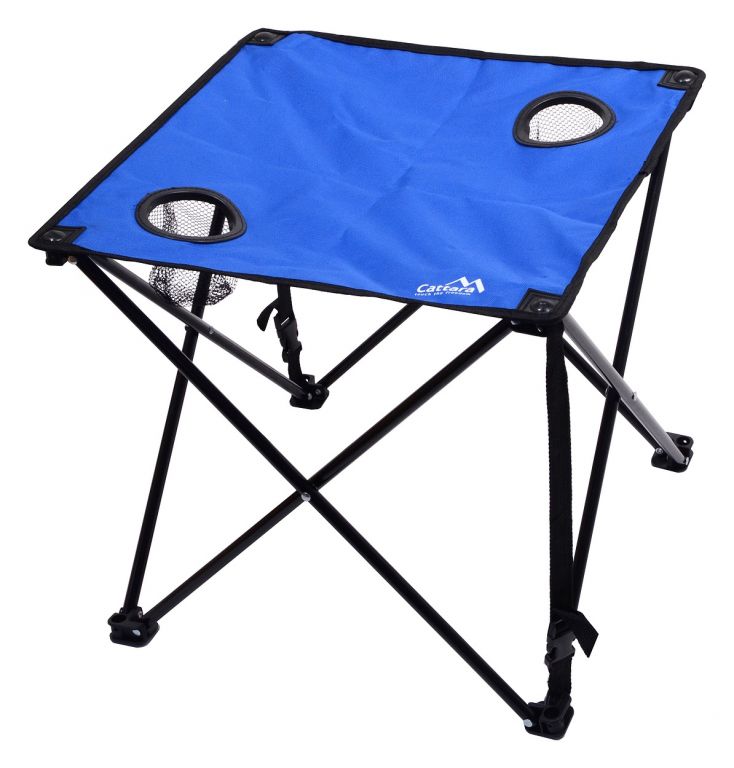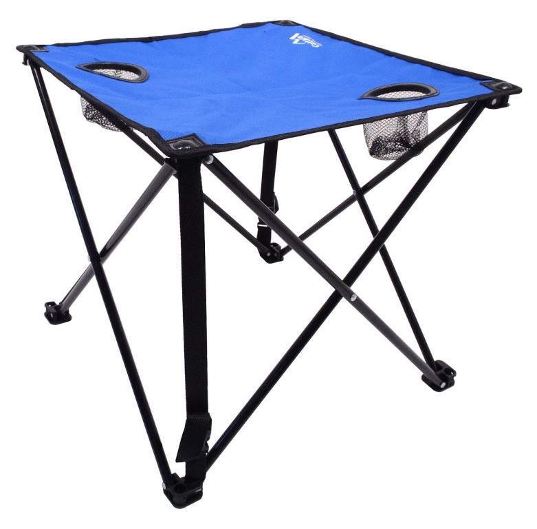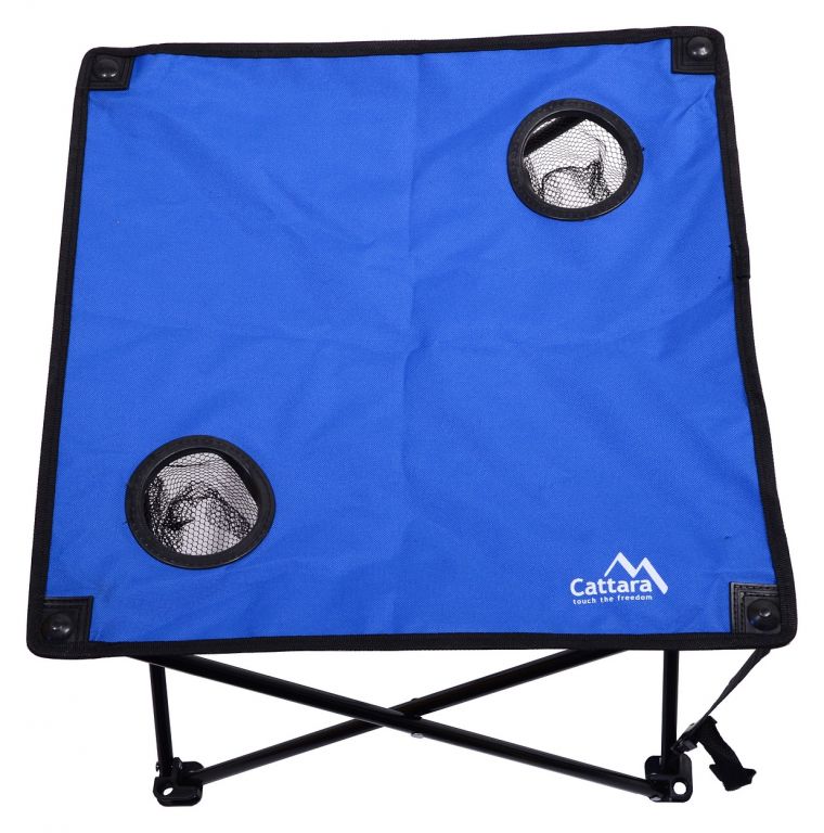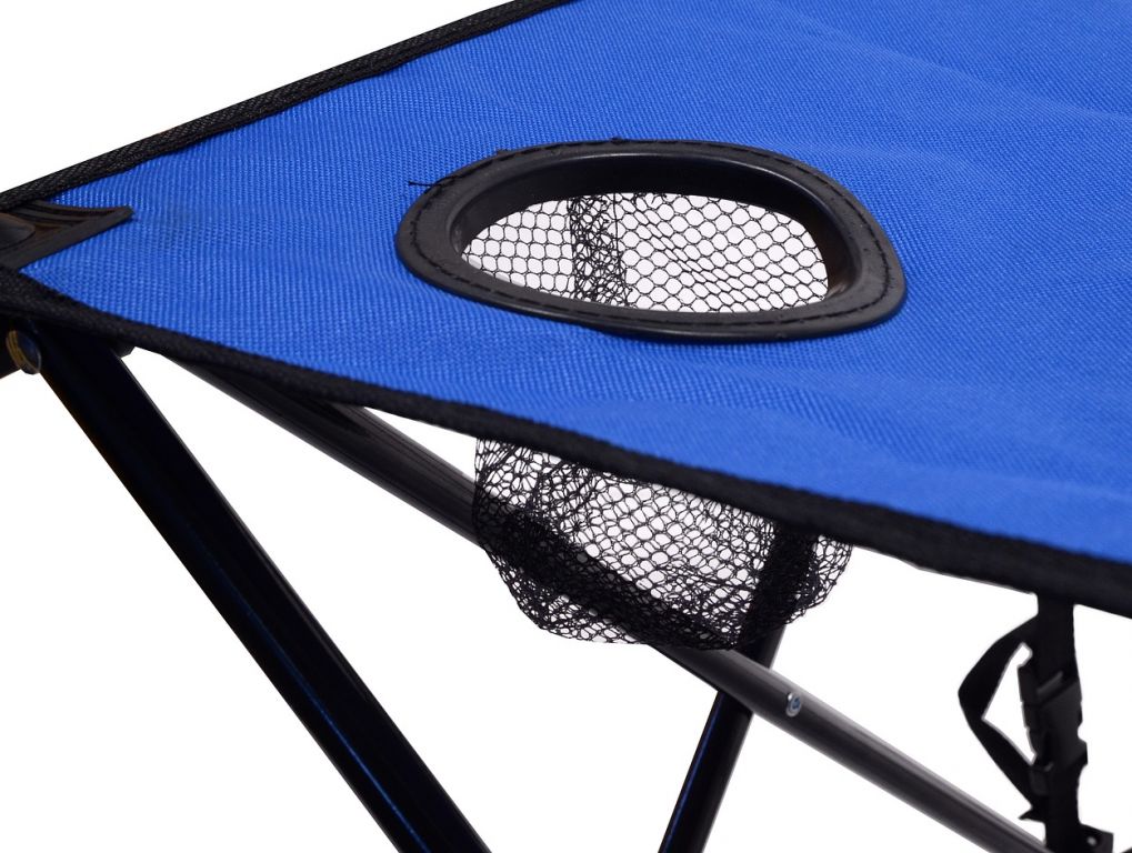Stół wyposażony jest w cztery nogi, które można przymocować do podłoża za pomocą kołków namiotowych, co znacznie zwiększa stabilność stołu. Sama powierzchnia stołu, na wysokości 45 cm, jest również wyposażona w dwa uchwyty na napoje.