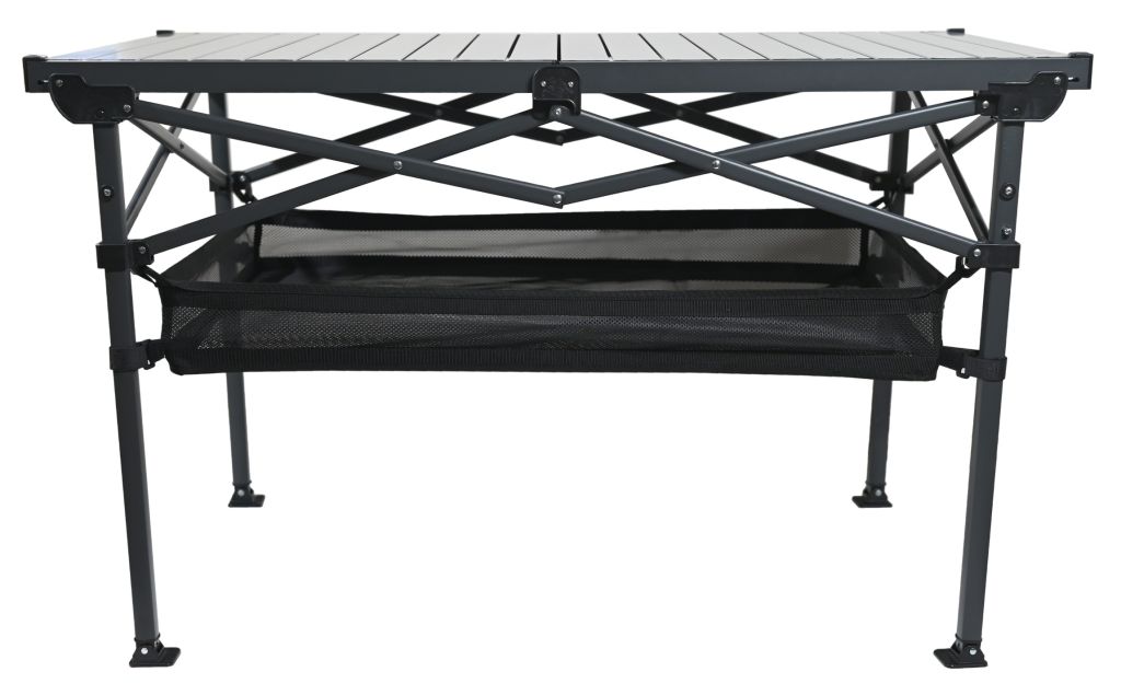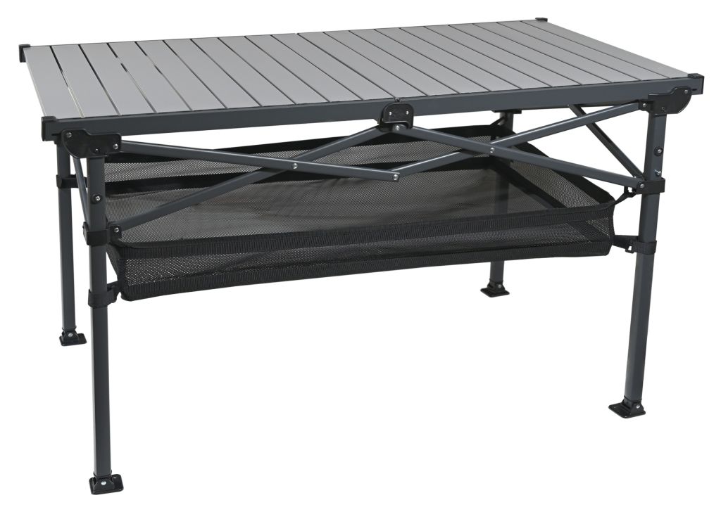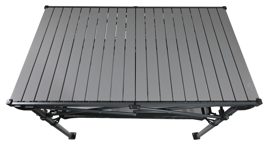 Stół ma aluminiowy blat z listwami o wymiarach 118 x 70 cm i wysokości 70 cm, co zapewnia dużo miejsca do przygotowywania i serwowania posiłków. Dzięki maksymalnemu udźwigowi do 100 kg stół jest wystarczająco wytrzymały, aby pomieścić cały sprzęt kempingowy i żywność.
