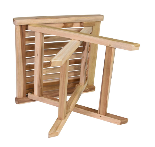 Naturalny, składany stołek z drewna tekowego – idealny do łazienki i przedpokoju.
