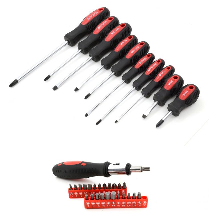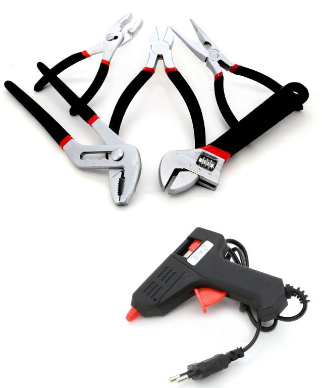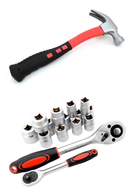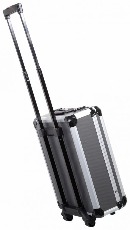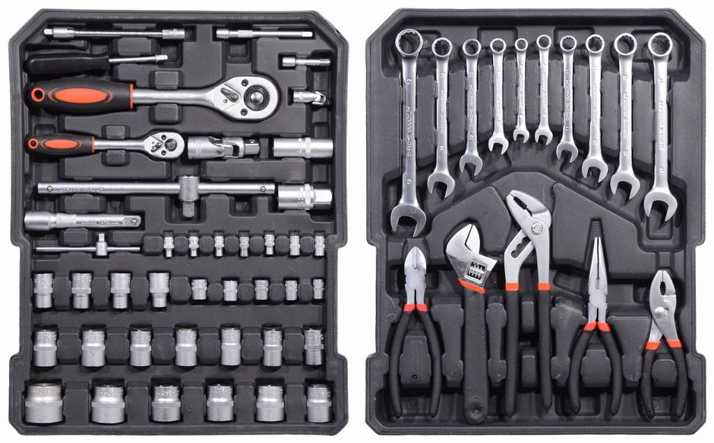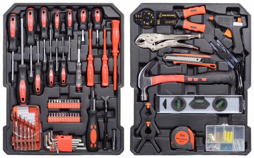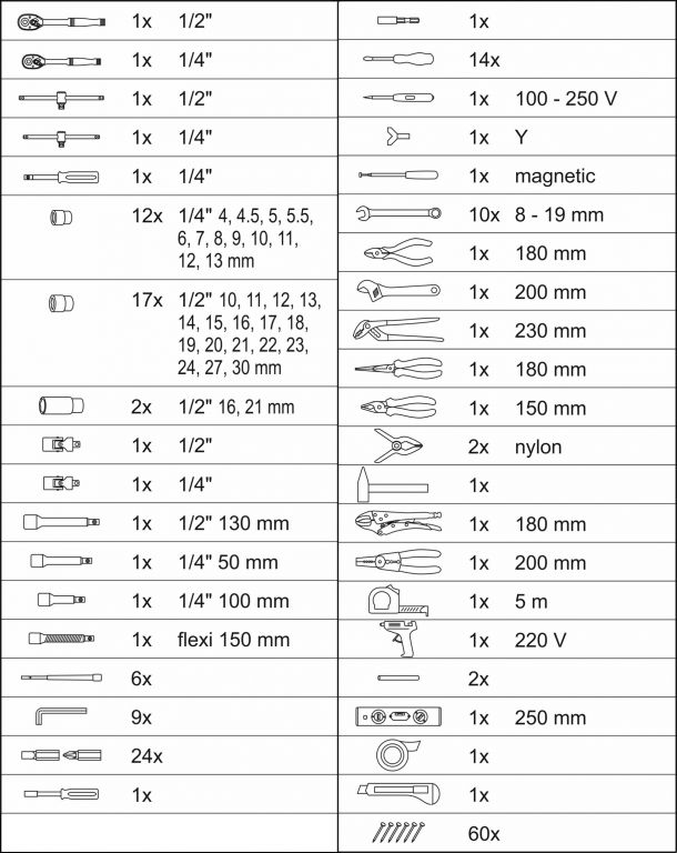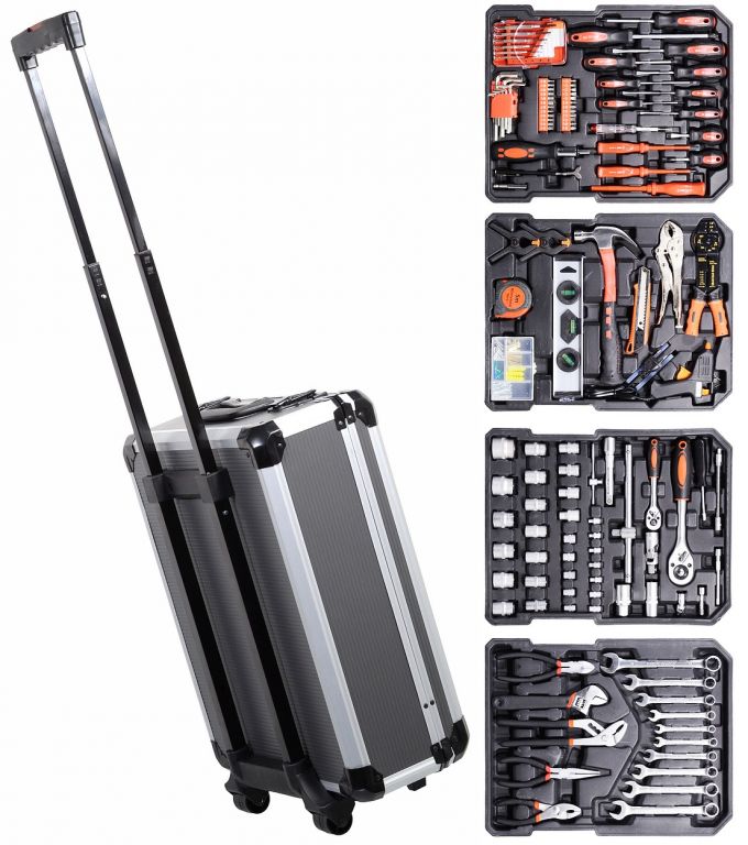 Wszystko rozmieszczone w przejrzystych pozycjach - 4 półki na narzędzia. Walizka jest wyposażona w teleskopowy uchwyt i kółka, co ułatwia obsługę całego zestawu narzędzi. Zestaw zawiera szeroką gamę szczypiec, śrubokrętów, kluczy nasadowych, młotka, poziomicy, kluczy bocznych i sześciokątnych, bitów, podstawowych elementów złącznych i wielu innych narzędzi odpowiednich do użytku w domu, w garażu i na drodze.