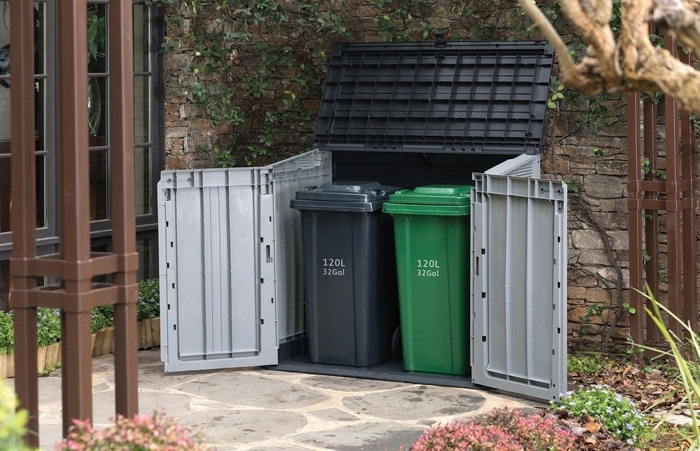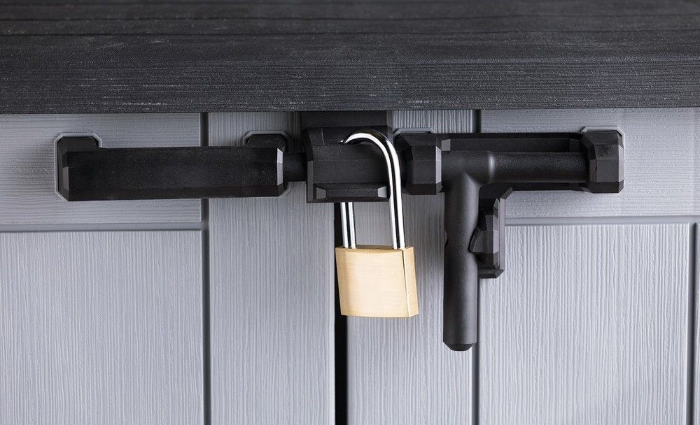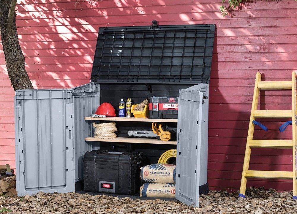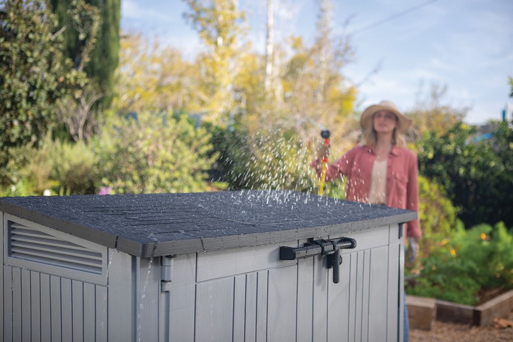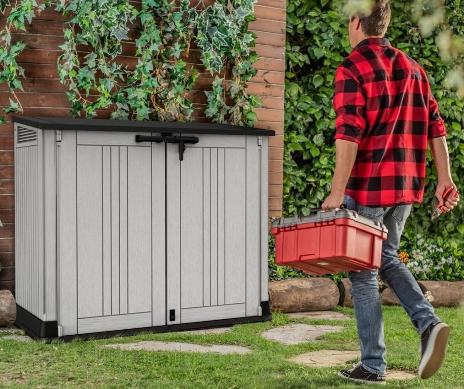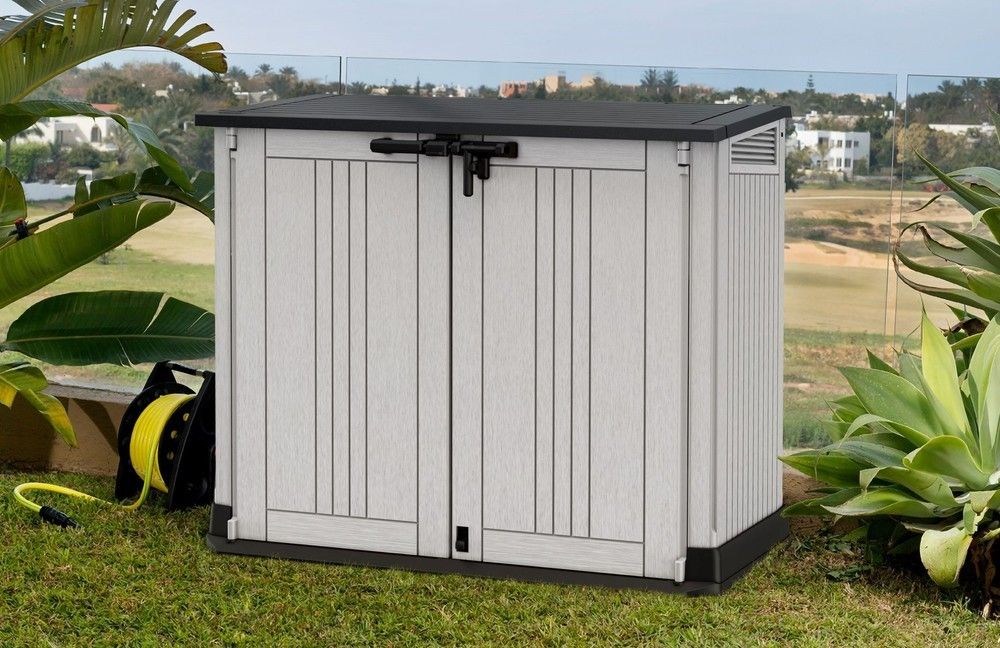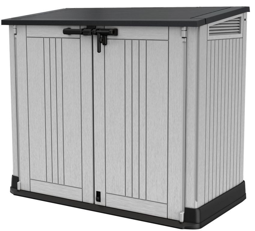 STORE IT OUT MIDI w nowej odsłonie jest wykonany z wyższej jakości i mocniejszych materiałów, które gwarantują jeszcze dłuższą żywotność produktu. Szafka do przechowywania charakteryzuje się prostym i eleganckim designem, a faktura powierzchni przypomina naturalne drewno. Szafa sprawdzi się wszędzie tam, gdzie konieczne jest przechowywanie akcesoriów ogrodowych, narzędzi lub np. pojemników (dwa pojemniki 120 l). Solidna rama chroni przechowywane przedmioty przed wilgocią, a wysokiej jakości tworzywa sztuczne zapewniają trwałość produktu przez wiele lat. Może być otwierany od góry lub od przodu i jest zamykany na klucz. Wentylacja.