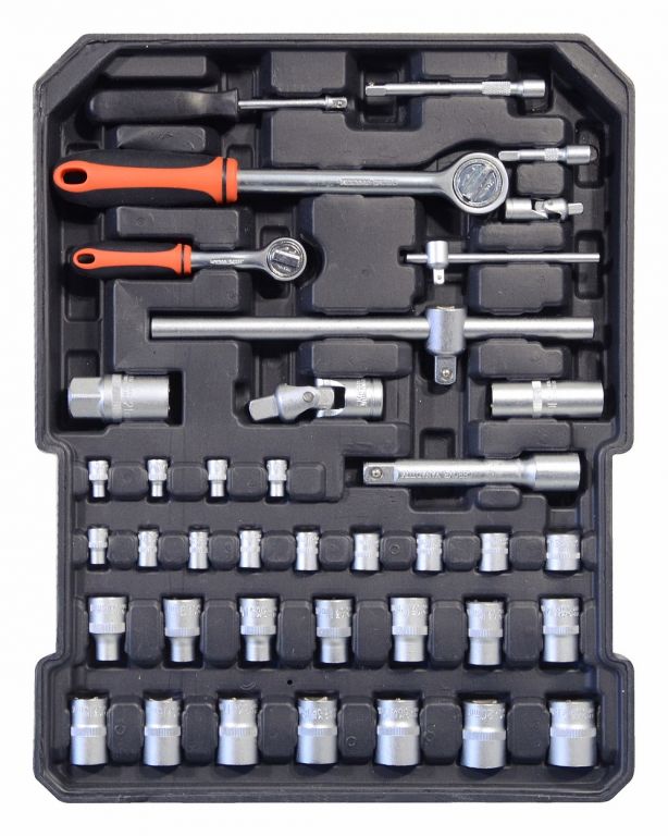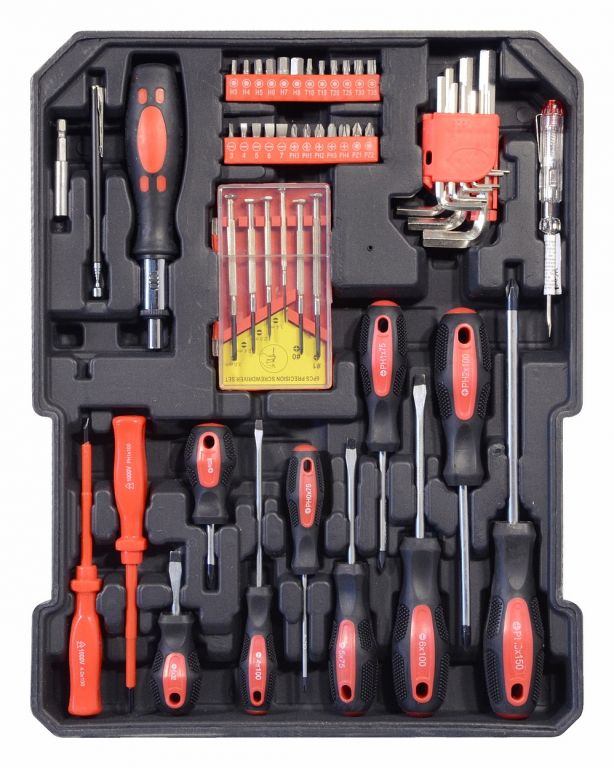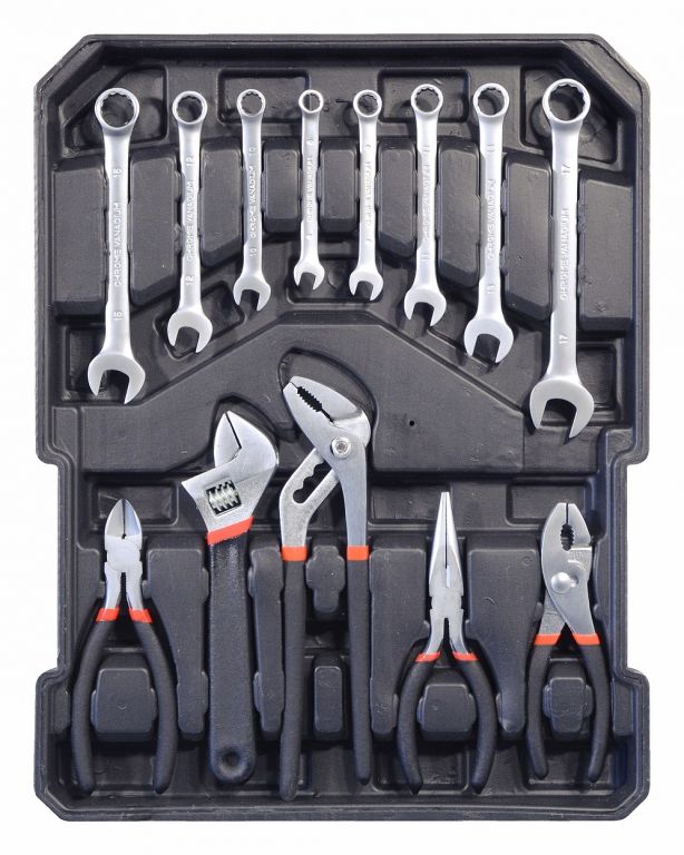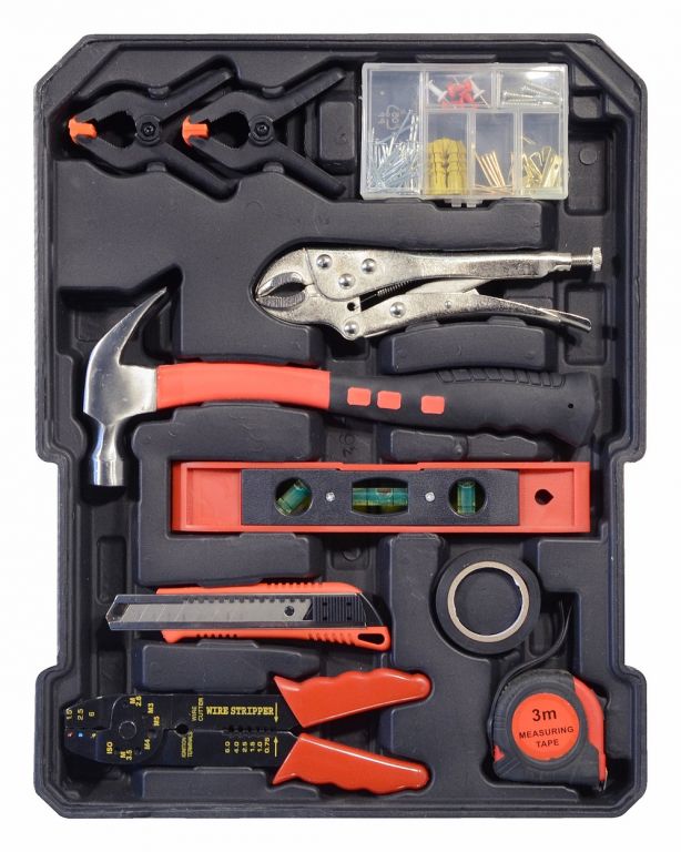 Zestaw zawiera różne szczypce, śrubokręty, klucze, młotek, poziomicę, klucze boczne i sześciokątne, końcówki, elementy mocujące podstawę i wiele innych narzędzi, które nadają się do użytku w domu, w garażu, a także na drodze.