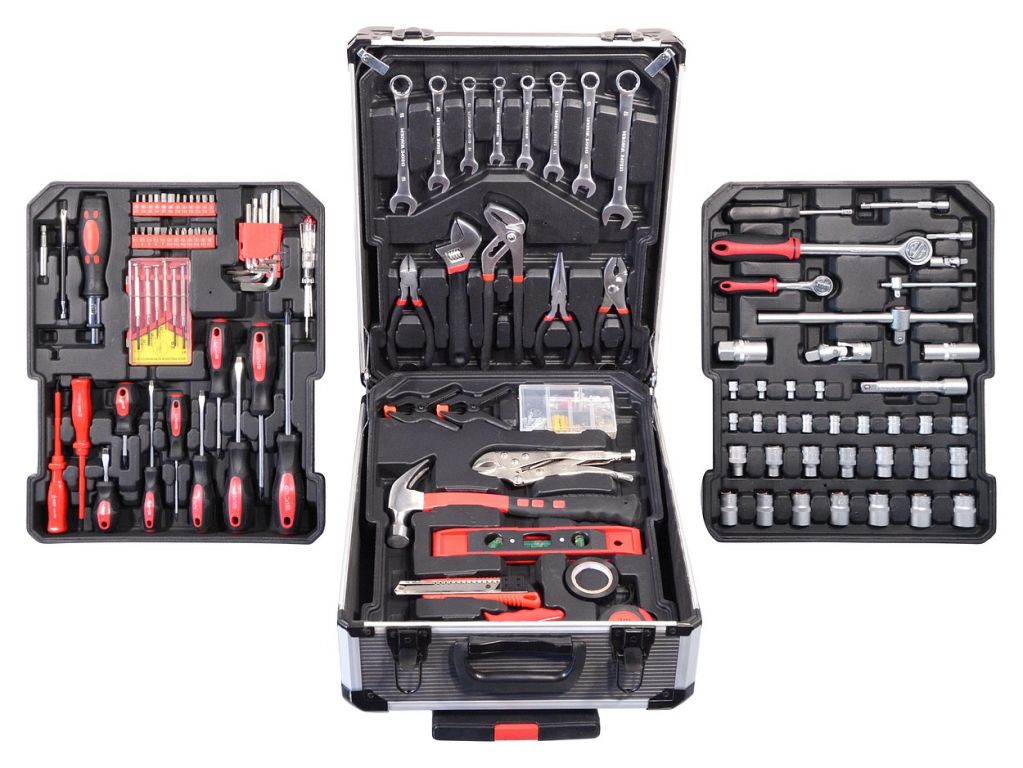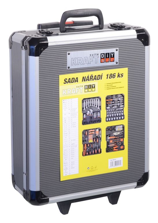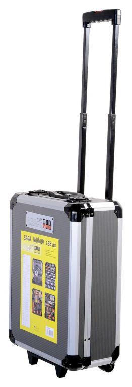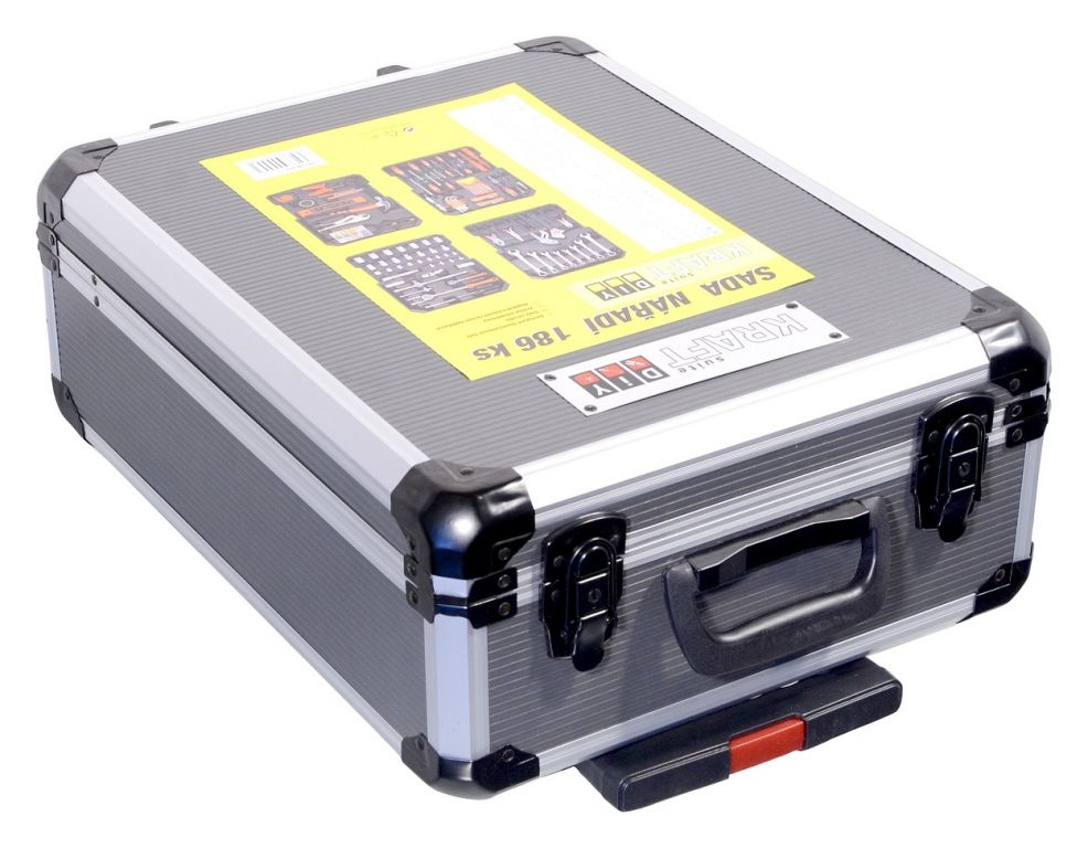 Praktyczna aluminiowa obudowa, 186 części narzędzi wysokiej jakości, wszystkie rozmieszczone w przejrzystych pozycjach - 4 poziomy na narzędzia.