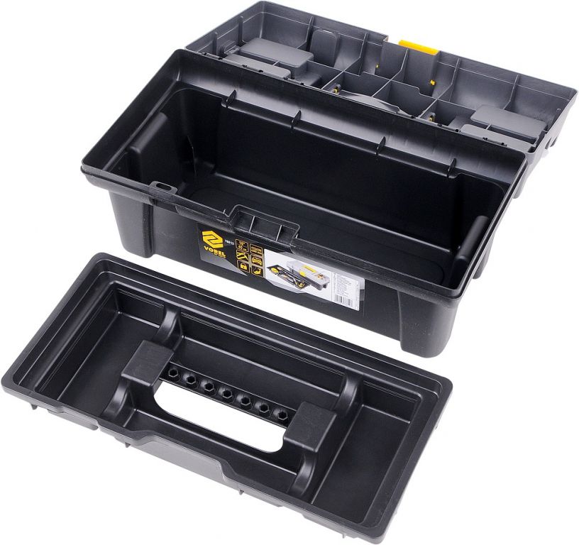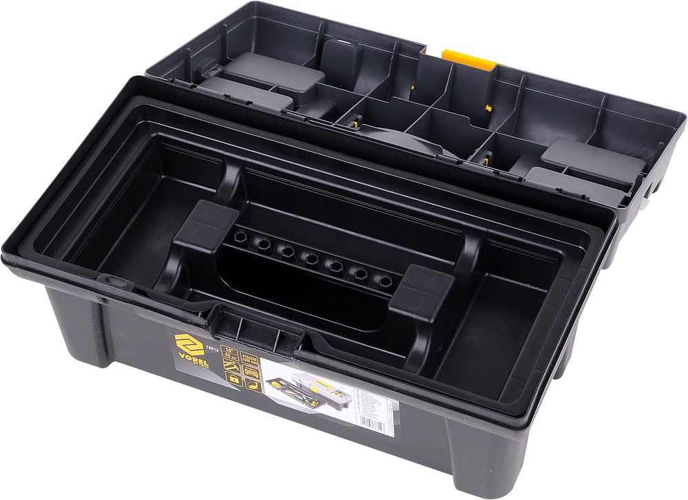 Plastikowa skrzynka z dwoma stałymi organizerami na pokrywie i zdejmowaną wewnętrzną wkładką na małe przedmioty.