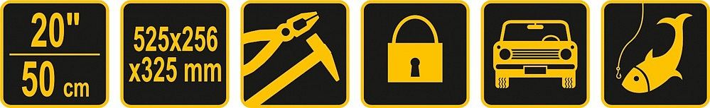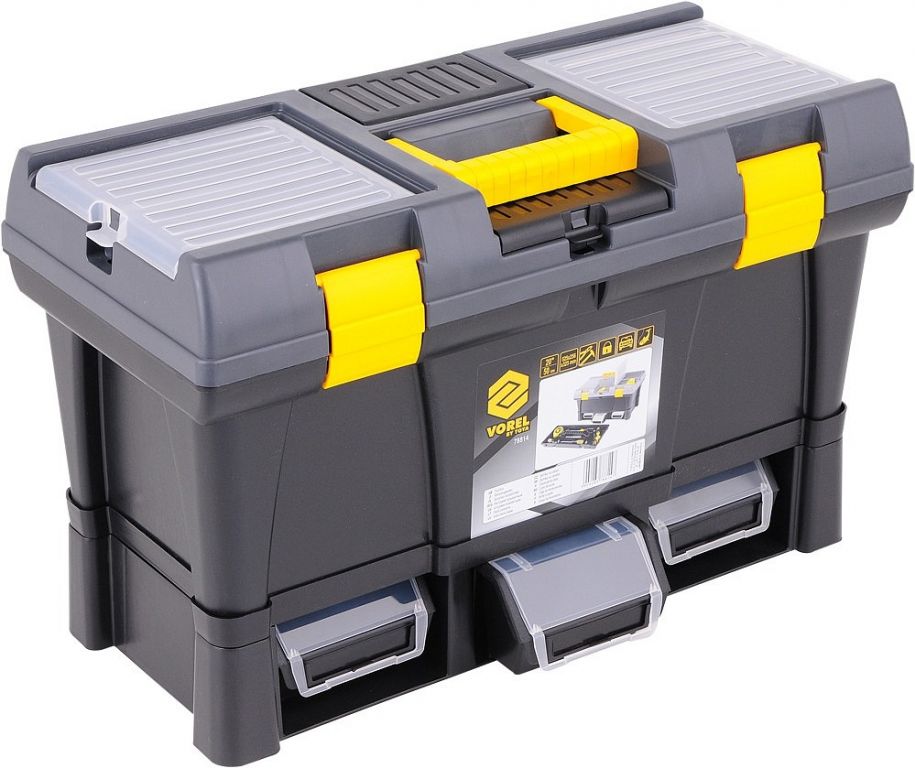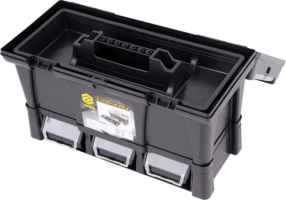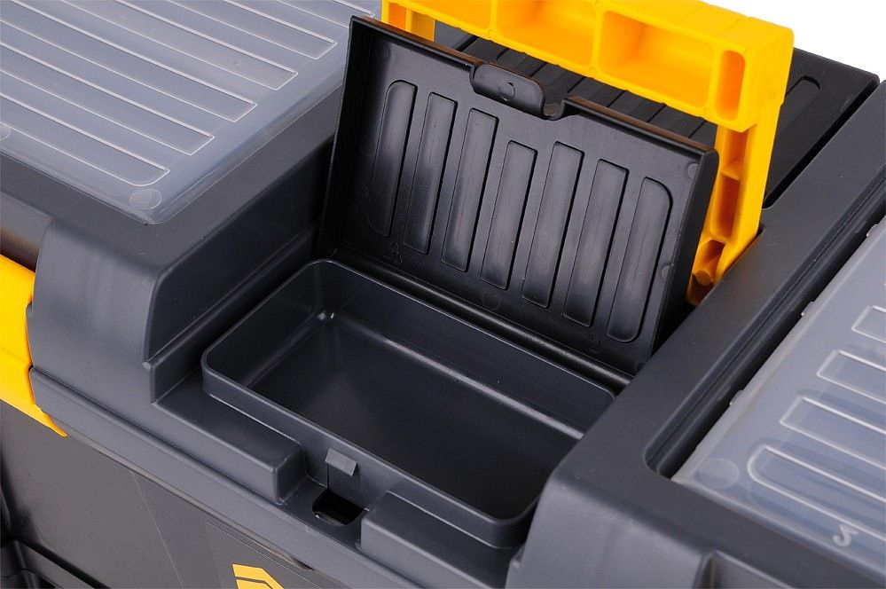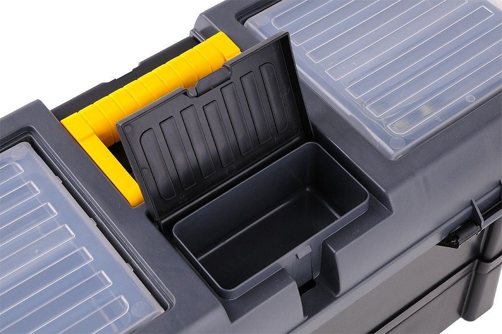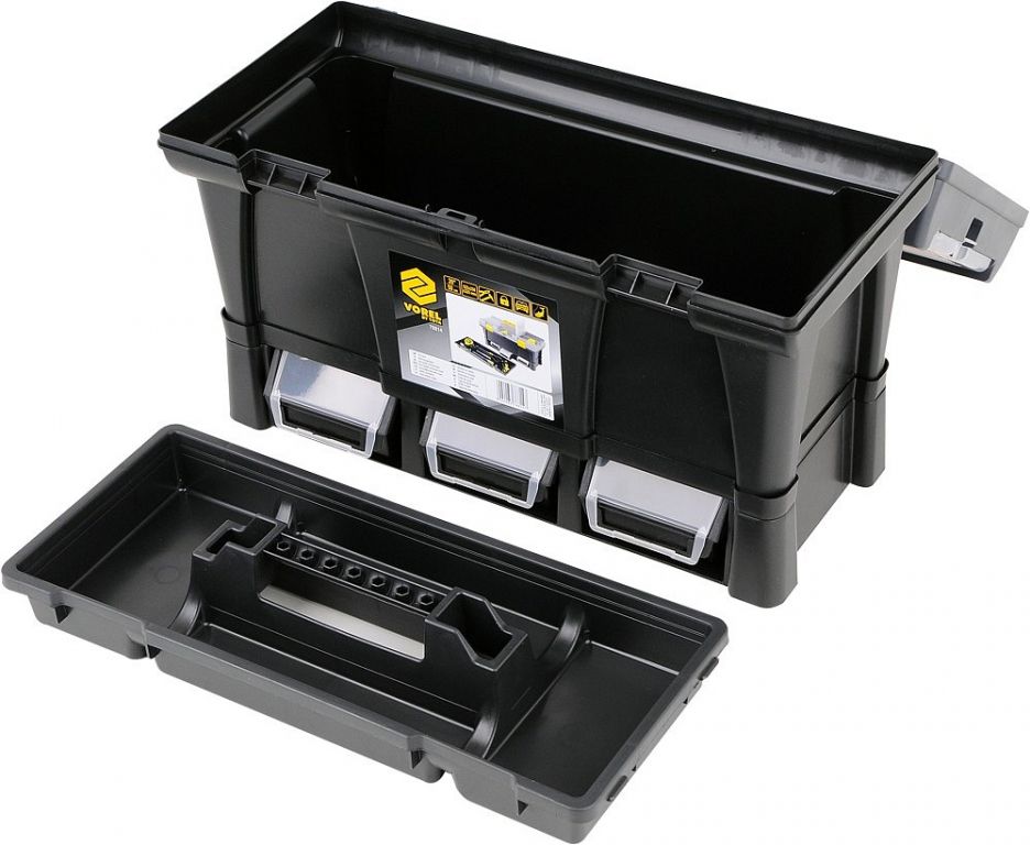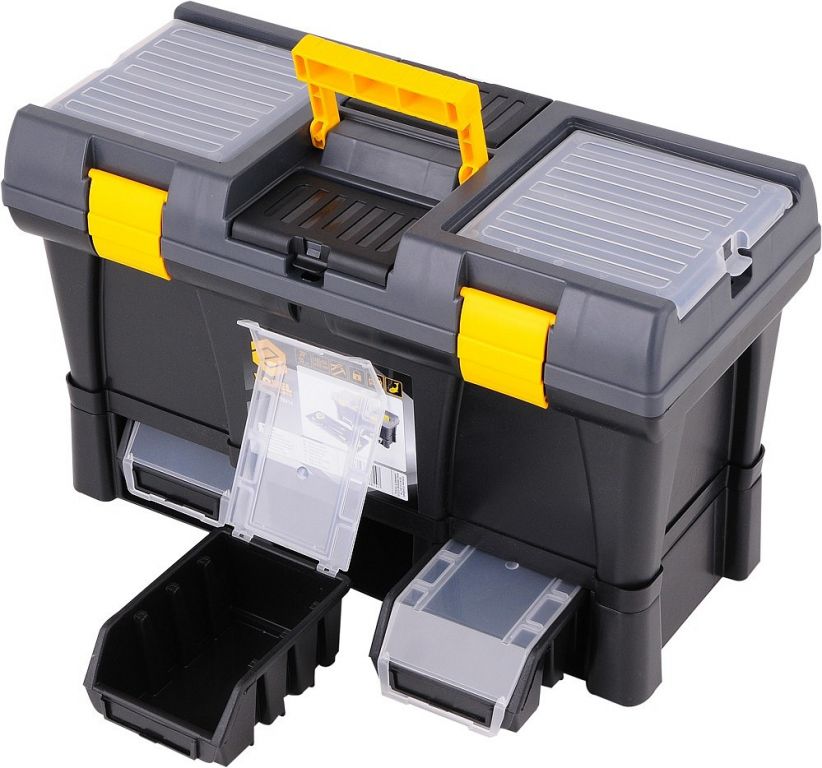 Plastikowa konstrukcja z zamykaną pokrywą na 2 zamki i wewnętrzną przenośną skrzynką na narzędzia. Dwa obszerne organizery po bokach pokrywki do przechowywania śrub, nakrętek lub innych elementów złącznych. Składany uchwyt na górze jest wystarczająco szeroki, aby przenosić duże odległości i skutecznie równoważy go, gdy pudełko jest pełne. Wyjmowaną część wewnętrzną można wyposażyć w niezbędne narzędzia, takie jak wkrętaki, taśmy miernicze, poziomice, młotki.