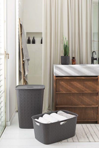 Kosz na pranie o pojemności 56 litrów inspirowany techniką tkania i pikowania, która tworzy wytłaczany wzór.