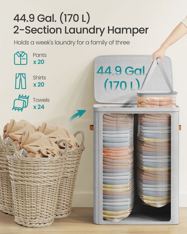 SONGMICS Kosz na pranie to idealne rozwiązanie dla każdego domu. Dzięki dwóm oddzielnym przegrodom oznaczonym „Jasne" i „Ciemne" szybko posegregujesz pranie i ułatwisz sobie cały proces. Kosz ma pojemność 170 litrów, co wystarcza na tygodniową ilość prania dla rodziny liczącej do trzech osób. Dzięki praktycznej pokrywie i wyjmowanym workom pranie pozostaje chronione, a Twoje mieszkanie – uporządkowane.