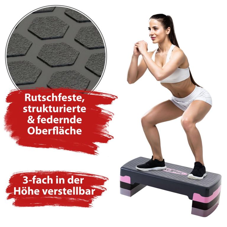 Stepper regulowany na trzech różnych wysokościach, idealny do treningu wytrzymałościowego, budowania mięśni i aerobiku.