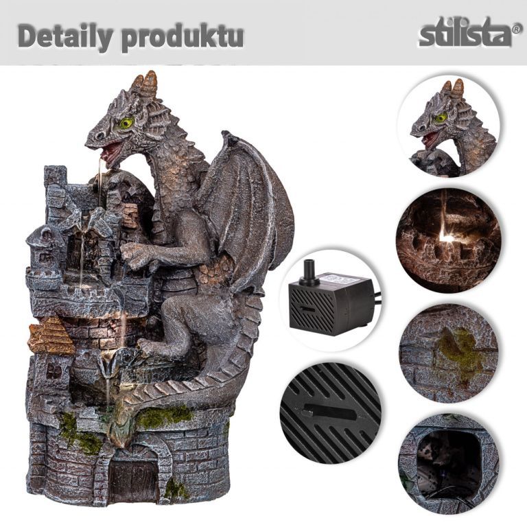 Dekoracyjna fontanna „Smok" zamieni Twój ogród lub taras w oazę dobrego samopoczucia. Zawiera płynnie regulowaną pompę o płynnej pracy, dzięki której woda płynie w obwodzie, dzięki czemu nie ma konieczności podłączania wody z zamówienia. Fontanna wykonana jest z wysokiej jakości poliżywicy odpornej na warunki atmosferyczne i promieniowanie UV.