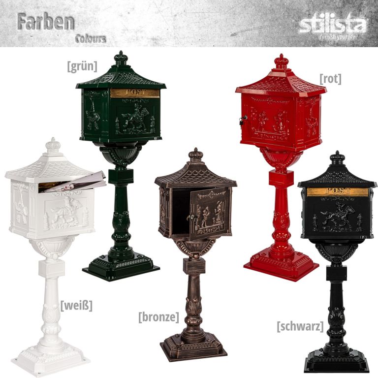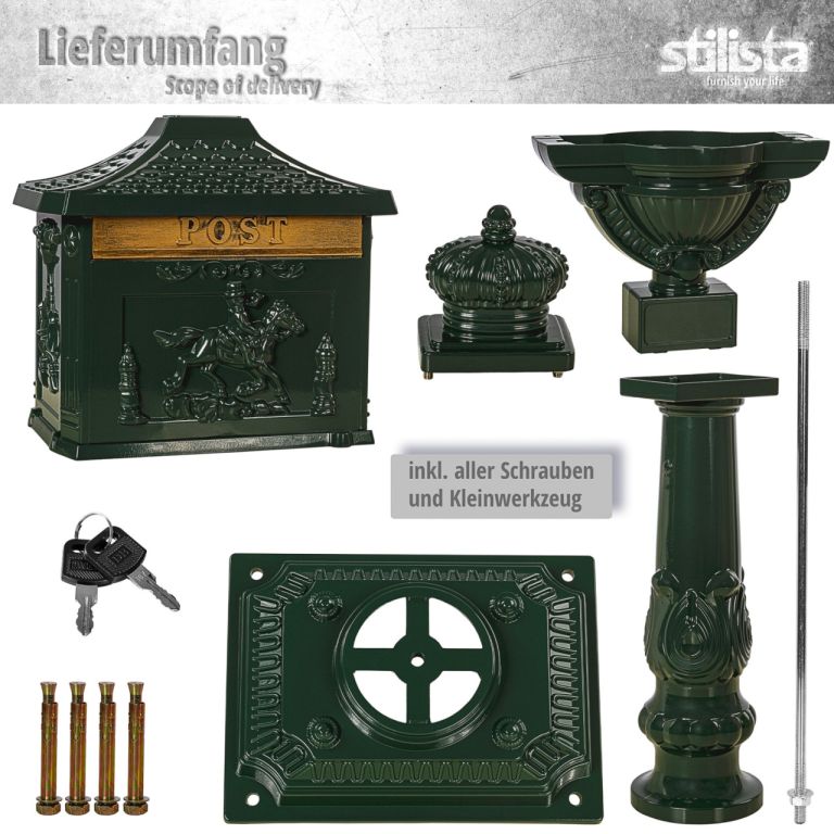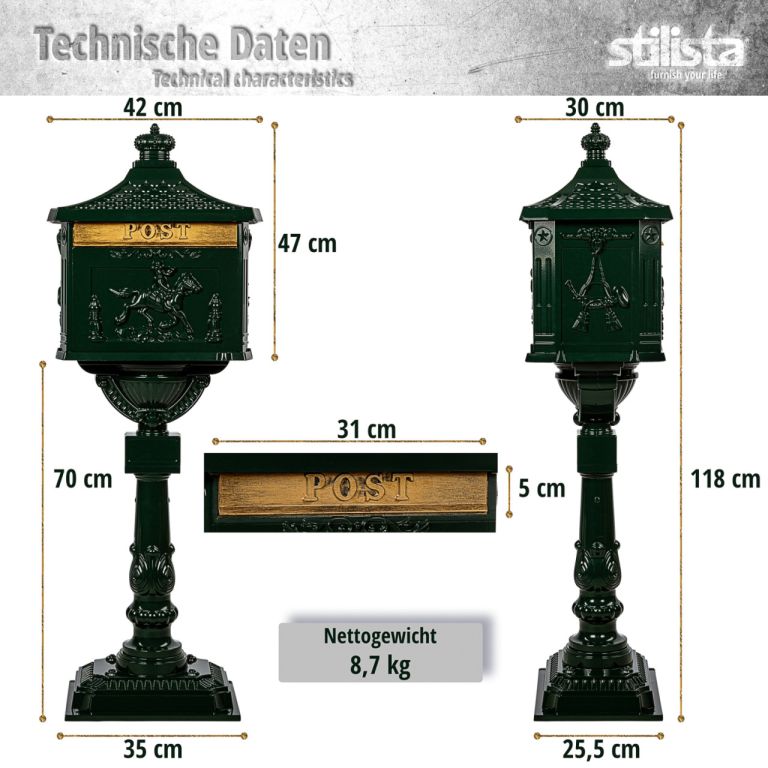 Wykonana z wysokiej jakości aluminium, odpornego na korozję i warunki atmosferyczne, ta skrzynka na listy oferuje idealne połączenie solidności i funkcjonalności. Kolumnowa skrzynka pocztowa zachwyca nie tylko nostalgicznym wyglądem, ale także długą żywotnością. Odporna na warunki atmosferyczne powłoka sprawia, że skrzynka pocztowa zapewnia optymalną ochronę nawet podczas deszczu, śniegu lub intensywnego nasłonecznienia. Elegancki design z artystycznymi zdobieniami dodaje ponadczasowej estetyki do strefy wejściowej. Skrzynka pocztowa w stylu vintage jest dostępna w wielu klasycznych kolorach. W ten sposób można idealnie dostosować skrzynkę pocztową do indywidualnych preferencji i istniejącej koncepcji projektowej. Skrzynka w klasycznym stylu zapewnia dużo miejsca na listy i gwarantuje ich bezpieczeństwo. Dzięki solidnej konstrukcji i wysokiej jakości materiałom można oczekiwać długotrwałego użytkowania bez kompromisów w zakresie jakości.