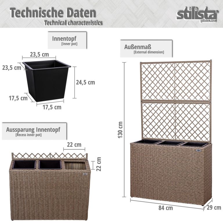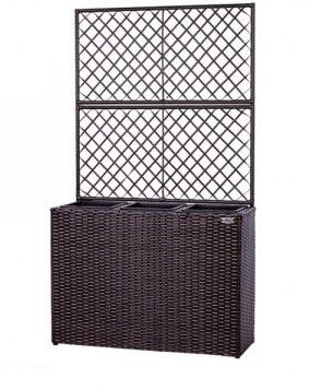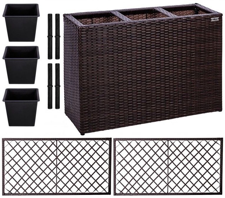 Piękny stojak na trzy doniczki to prawdziwa atrakcja dla Twojego domu. W donicach znajdują się również dwie kratki, które można wyhodować wraz z pnączami i stworzyć naturalną zieloną ścianę, która da poczucie prywatności. Stojak idealnie nadaje się do sadzenia w ogrodzie, na tarasie lub na balkonie. Materiał przekona Cię swoimi doskonałymi właściwościami: jest odporny na warunki atmosferyczne, promieniowanie UV, odpycha brud i jest łatwy w utrzymaniu czystości. Zdejmowane donice wewnętrzne wyposażone są w zamykany odpływ wody, co zapobiega przemoczeniu.