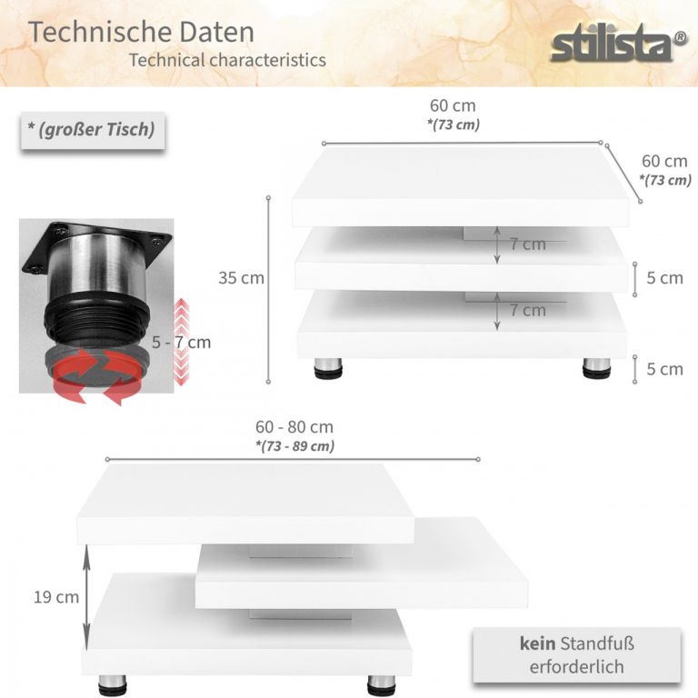 Ten stolik kawowy jest prawdziwą atrakcją Twojego domu i zachwyci swoim designem i jakością. Dwa górne blaty stołu można obracać o 360°, dzięki czemu dopasujesz stół do swoich upodobań i przestrzeni. Posiada regulowane nóżki z ochraniaczami na podłogę. Przestrzeń do przechowywania stolika bocznego między płytami jest idealna do przechowywania czasopism, pilotów i wielu innych.