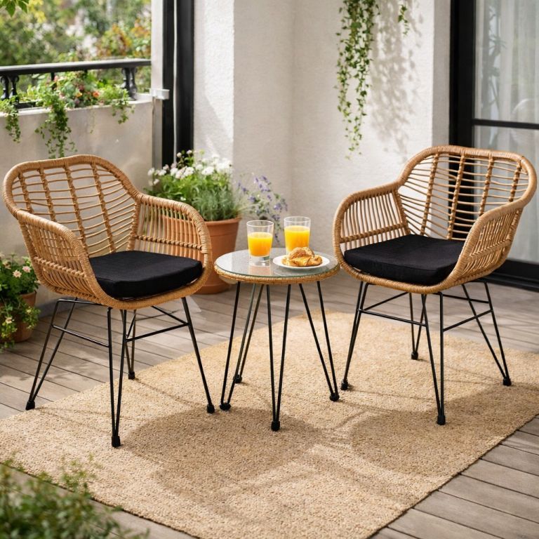 Nasz zestaw balkonowy w stylu rattanu nadaje się zarówno do użytku wewnątrz, jak i na zewnątrz. Krzewsła o ergonomicznym kształcie z siedziskami o grubości 5 cm zapewniają wysoki komfort siedzenia. Dzięki regulowanym śrubom poziomującym na nogach krzeseł i stołu bardzo łatwo zniwelować nierówności podłoża. Solidny stelaż mebli ogrodowych wykonany jest z ocynkowanego i malowanego proszkowo metalu, łatwa w pielęgnacji "wiklina" wykonana jest z wysokiej jakości polirattanu.