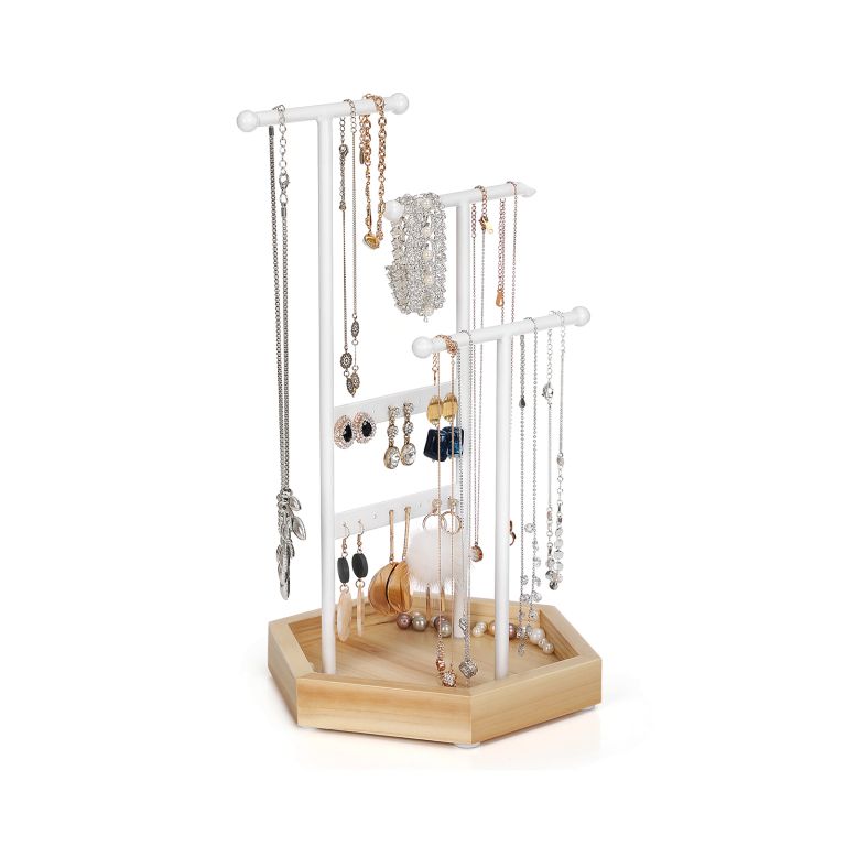 Stojak na biżuterię z drewna i stali, 3 poziomy, biały