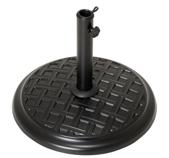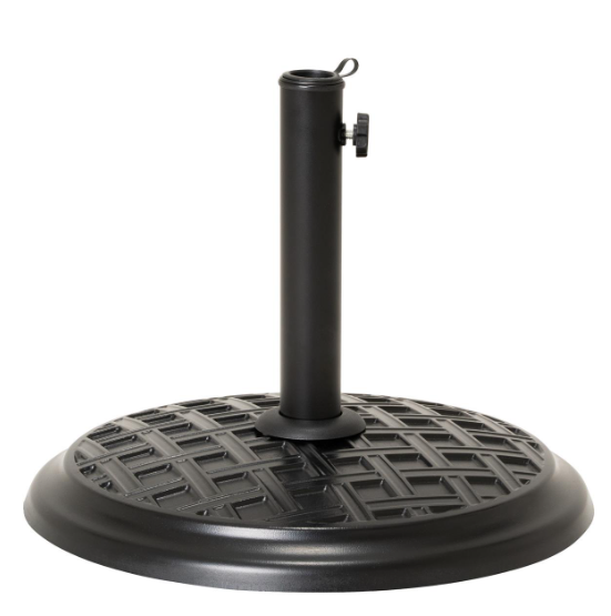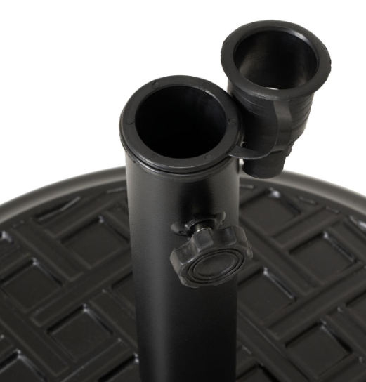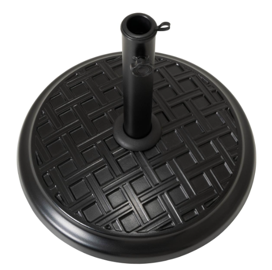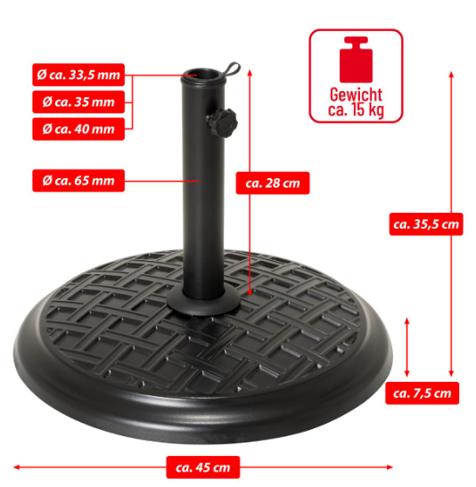Ten solidny okrągły stojak na parasole wykonany z betonu nie tylko spełnia swoją funkcję jako bezpieczny uchwyt na parasol, ale także dobrze wygląda, jest lekki i praktyczny. Stojak jest pokryty czarną powłoką i ma dekoracyjny wzór. Wyposażony w śrubę blokującą, która mocuje parasol. Idealny na taras lub balkon. Okrągły talerz ma średnicę ok. 45 cm. Dzięki wadze 15 kg stojak nadaje się do parasoli do 2 m - nie do parasoli wspornikowych. Zwróć również uwagę na inne nasze artykuły ogrodowe, takie jak parasole, stoły, krzesła składane, krzesła piętrowe, leżaki, ławki wykonane z metalu, plastiku lub drewna.