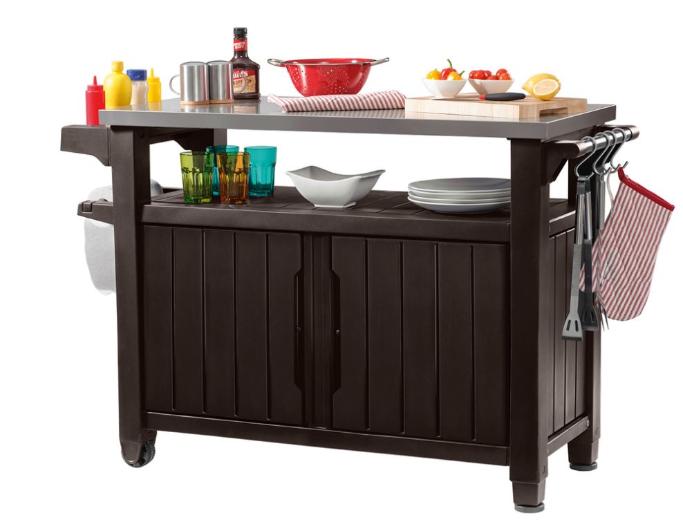 Nowoczesna mobilna szafka, którą szczególnie docenisz podczas grillowania! Pojemna szafa z podwójnymi drzwiami wyposażona w funkcjonalny blat ze stali nierdzewnej oraz praktyczny uchwyt z wieszakiem na ręczniki, sprawdzi się podczas ważnych rodzinnych spotkań na tarasie czy w ogrodzie.