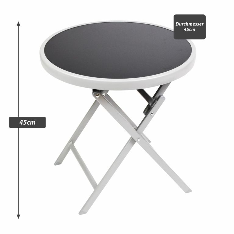 Ten praktyczny, okrągły stolik ze szklanym blatem i składanym, stabilnym ramieniem jest idealny do przechowywania napojów i jedzenia w Twoim ogrodzie, na balkonie lub tarasie. Stół jest wyjątkowo stabilny i ma przestronną powierzchnię o średnicy 45 cm. Składana konstrukcja zapewnia szczególną stabilność. Stół jest odporny na warunki atmosferyczne i łatwy w utrzymaniu. Ten wizualnie nietypowy metalowy stół jest idealnym uzupełnieniem Twojego ogrodu lub balkonu.