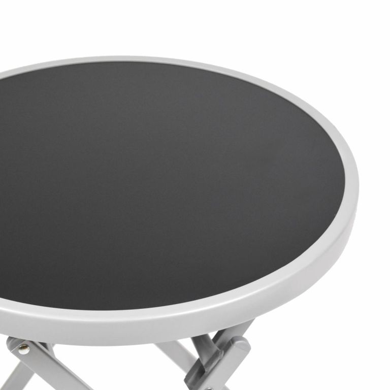 Elegancki składany stolik z blatem z przyciemnianego szkła i stabilną metalową ramą jest idealny na balkon, taras lub do ogrodu, odporny i łatwy w utr