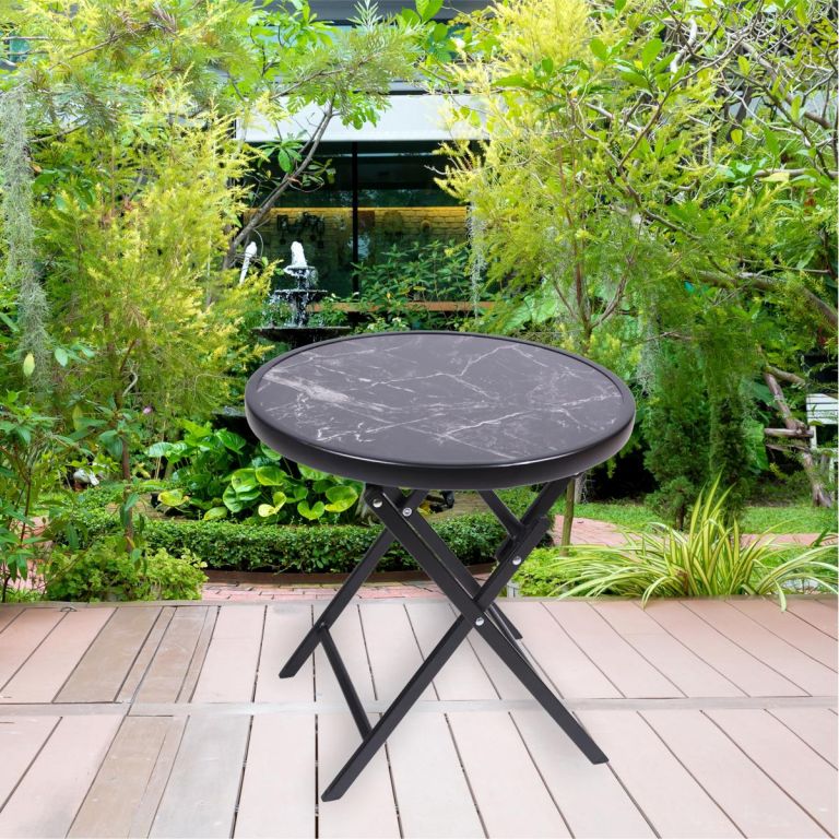 Elegancki składany stolik z czarnym marmurowym blatem i stabilną metalową ramą jest idealny na balkon, taras lub do ogrodu, odporny i łatwy w utrzyman