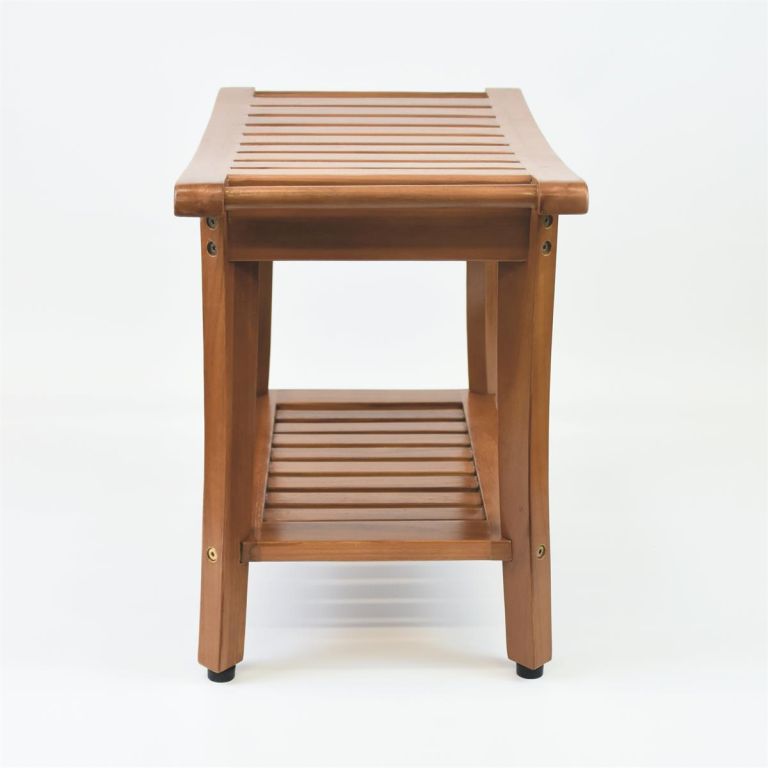 Stolik z drewna tekowego o ponadczasowym, klasycznym i neutralnym designie. Ten dekoracyjny i praktyczny element na pewno będzie ozdobą Twojego mieszkania, korytarza, łazienki lub innych pomieszczeń. Zainstalowane uchwyty po lewej i prawej stronie siedziska mogą służyć do przechowywania ręczników, na przykład. Stolik jest szczególnie atrakcyjny dzięki zakrzywionemu siedzisku, wykonany z drewna tekowego, przyciąga uwagę swoją naturalną urodą i jest łatwy do czyszczenia. Mogą wystąpić minimalne odchylenia w wymiarach, a rysunek drewna jest zawsze indywidualny. Drewno zostało chemicznie zabezpieczone i wytrzymuje pewną wilgoć. Używanie na zewnątrz przy wietrze, deszczu i w zmiennych warunkach pogodowych nie jest zalecane.