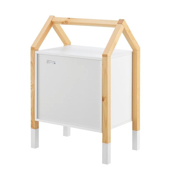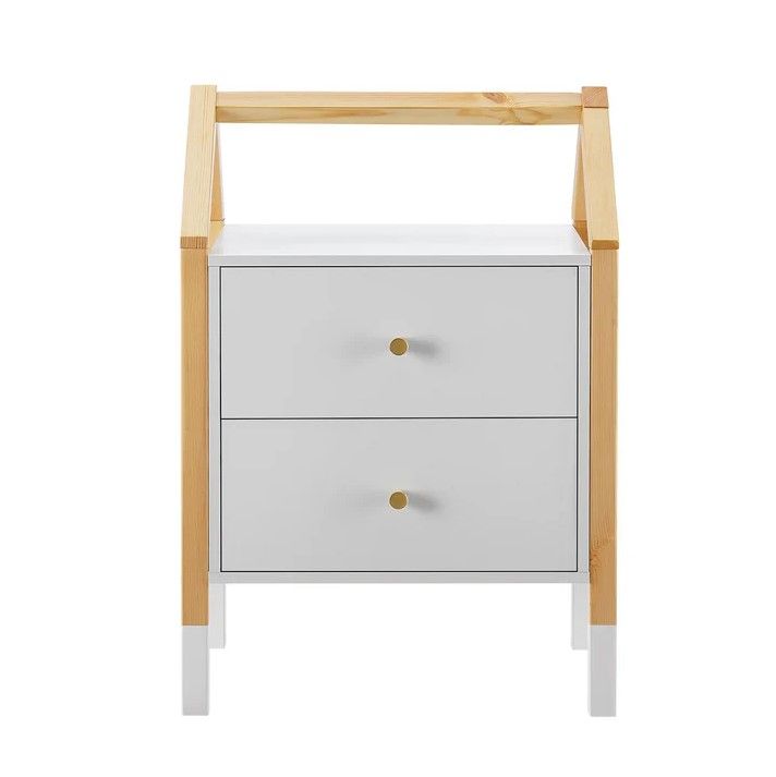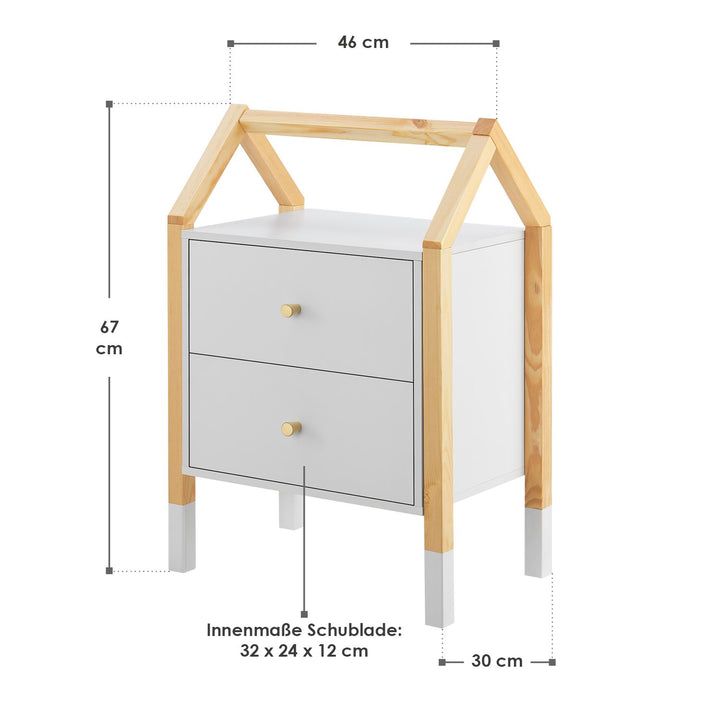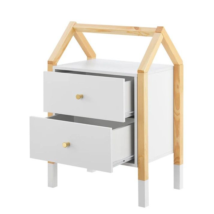 Ukazać szczegółowy opisStylowy stolik nocny Enny z szufladami w kształcie domku do dziecięcego pokoju.