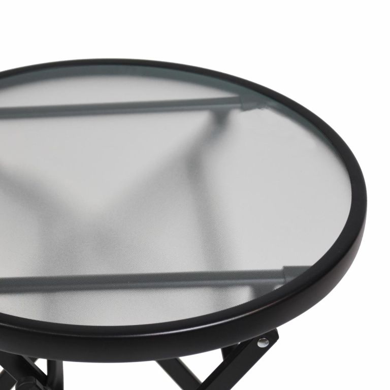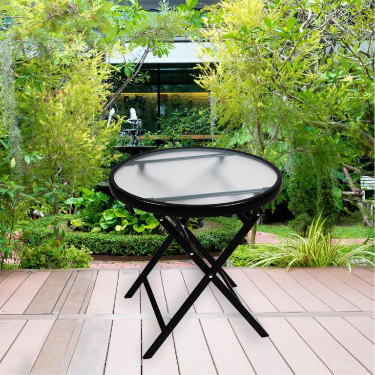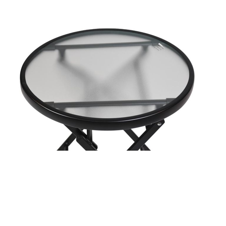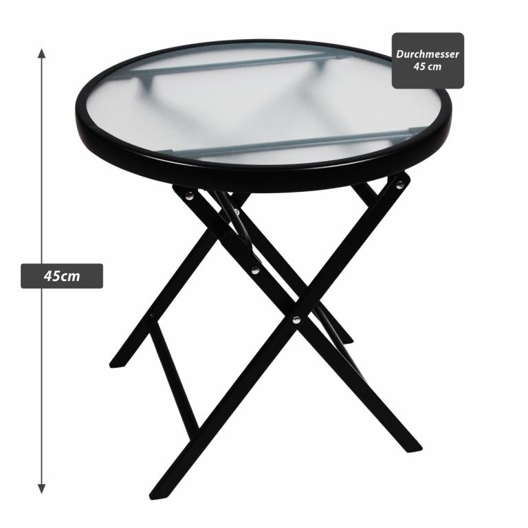 Ten praktyczny, okrągły stolik pomocniczy ze szklaną blatem i składanym, stabilnym stelażem jest idealny do ogrodu, zimowego ogrodu, na balkon lub taras. Szklany stół jest bardzo stabilny i ma przestronną powierzchnię o średnicy 45 cm oraz wysokości 45 cm. Stół jest odporny na warunki atmosferyczne i łatwy w utrzymaniu.