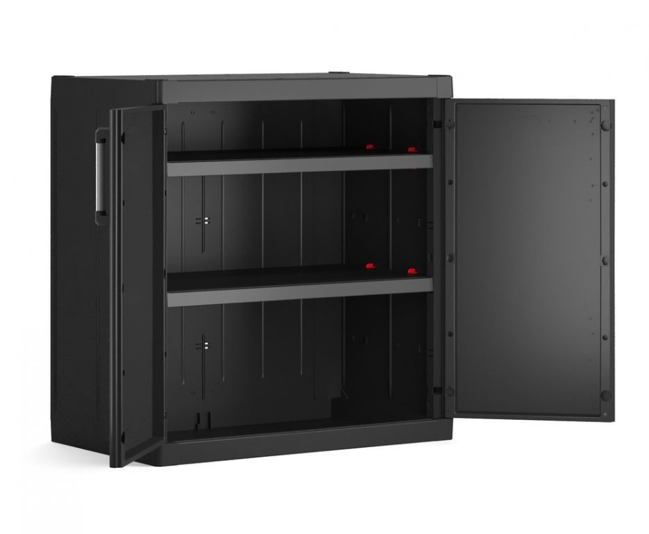 Szafka z tworzywa sztucznego wyróżnia się doskonałym designem, łatwym montażem i szeroką gamą wariantów. Zapewnia przesuwne półki dzięki systemowi SLO, zamykanie na kłódkę, możliwość łączenia szafek ze sobą oraz optymalne uchwyty. Półki z łatwością wyregulujesz dzięki blokadzie bezpieczeństwa SLO wyposażonej w zamki na kłódkę. 2 półki o nośności 25 kg, od spodu posiadają rowki do ewentualnego wkładania pudełek. Nadaje się do warsztatów, garaży, sal operacyjnych, ale także na zadaszone tarasy czy altany ogrodowe.