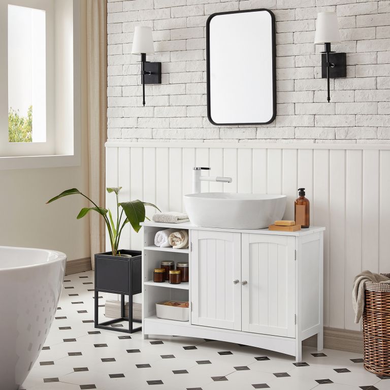 Stylowa szafka pod umywalkę z białym wykończeniem i regulowanymi półkami. Idealna do każdej łazienki.