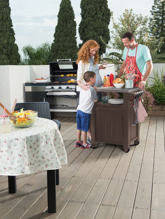 Mobilna szafa, które szczególnie docenisz podczas grillowania! Pojemna szafa z podwójnymi drzwiami wyposażona w funkcjonalny blat ze stali nierdzewnej oraz praktyczny uchwyt z haczykiem na ręcznik sprawdzi się podczas ważnych rodzinnych spotkań na tarasie lub w ogrodzie.