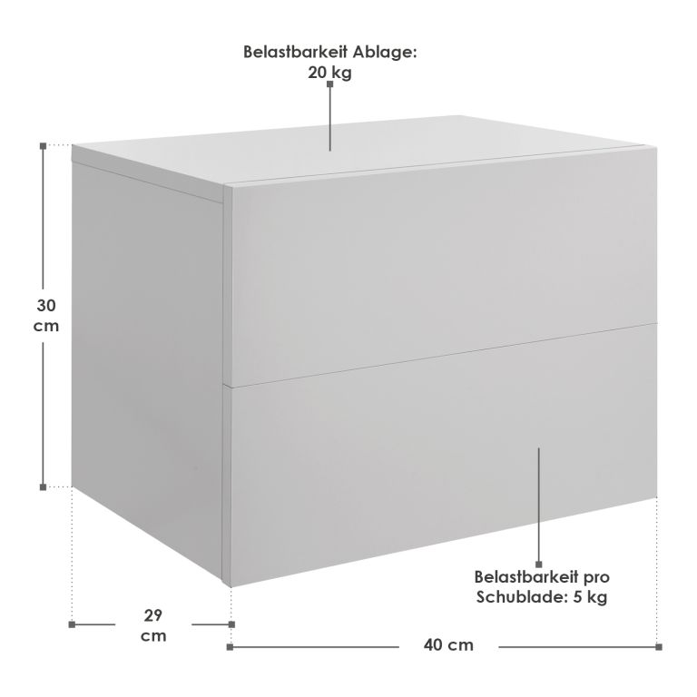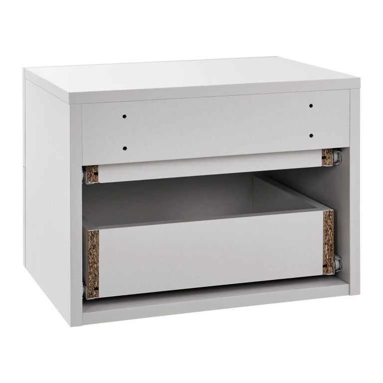 Wysokiej jakości płyta wiórowa oraz odporna na zarysowania powłoka gwarantują trwałość i łatwość utrzymania czystości. System montażu na ścianie pozwala zaoszczędzić miejsce i ułatwia sprzątanie pod szafką.