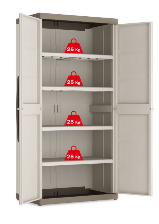 Plastikowe obudowy serii Excellence XL wyróżniają się przyjemnym designem, łatwym montażem, szeroką gamą wariantów i doskonale przylegającymi uchwytami. Możesz je zabezpieczyć kłódką, wkomponować w nie skrzynki magazynowe i dzięki systemowi połączeń stworzyć całą szafę montażową. Są doskonałym rozwiązaniem w miejscach zagrożonych zalaniem i zawilgoceniem. Szafki Excellence bez problemu wypłukujesz, nie martwiąc się o rdzewienie czy zgniliznę.Ta szafka doskonale sprawdzi się we wnętrzu domu lub mieszkania do przechowywania ubrań, pościeli, a także detergentów i wielu innych materiałów. Przesuwając półki, możesz dostosować przestrzeń do swoich potrzeb. Łatwy w utrzymaniu, nie rdzewieje, nie gnije. System połączeń do tworzenia zestawu szafowego. 4 regulowane półki po 25 kg każda. Praktycznie otwierane drzwi, klamki trzymają się bardzo wygodnie i dobrze.