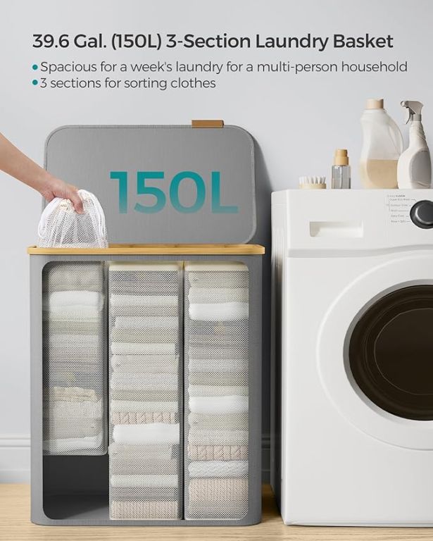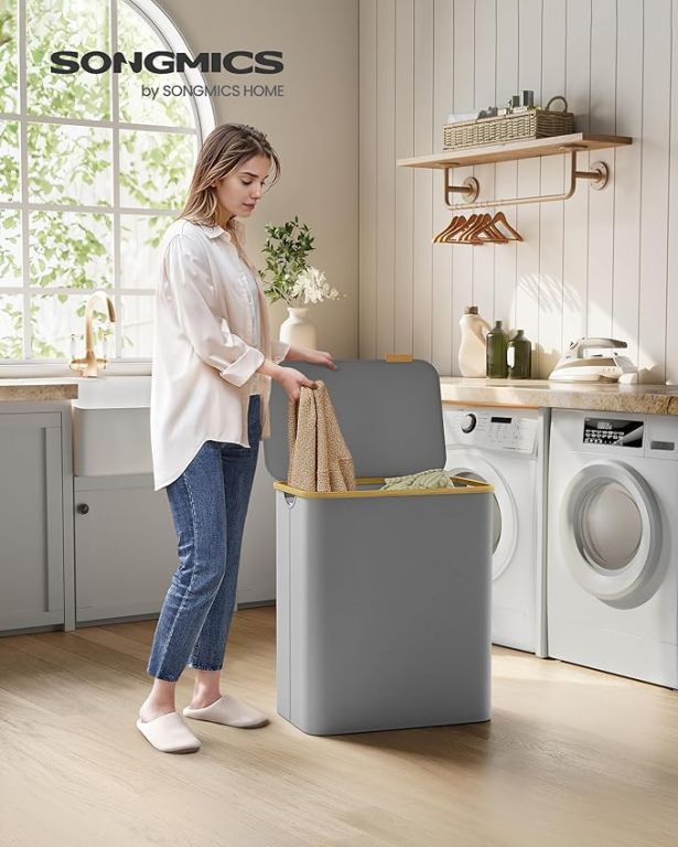 Odkryj wygodę i estetykę w codziennych obowiązkach z dużym koszem na pranie o pojemności 150 litrów. Trzy komory umożliwiają szybkie i wygodne sortowanie ubrań, a elegancki szary kolor z bambusowymi akcentami wprowadza harmonię do każdej łazienki czy sypialni.