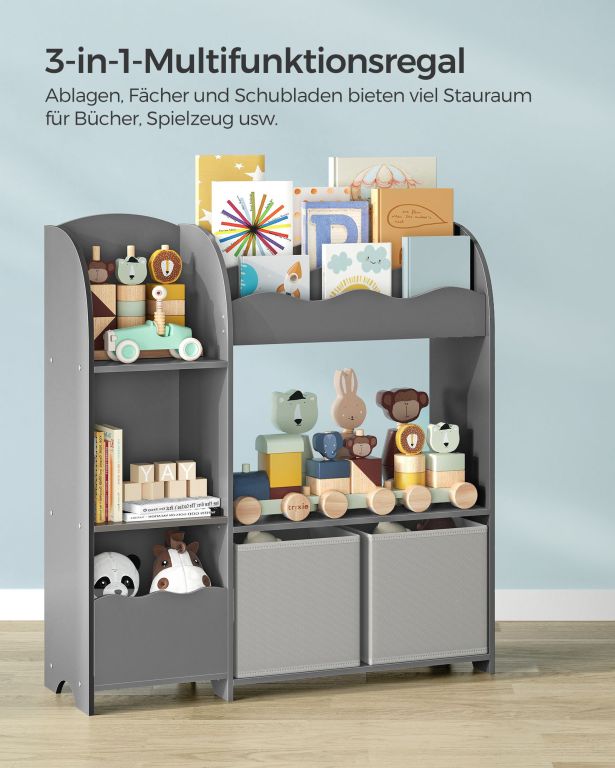 Regał dziecięcy 3w1: półki, schowki i pudełka na zabawki w eleganckim szarym kolorze.