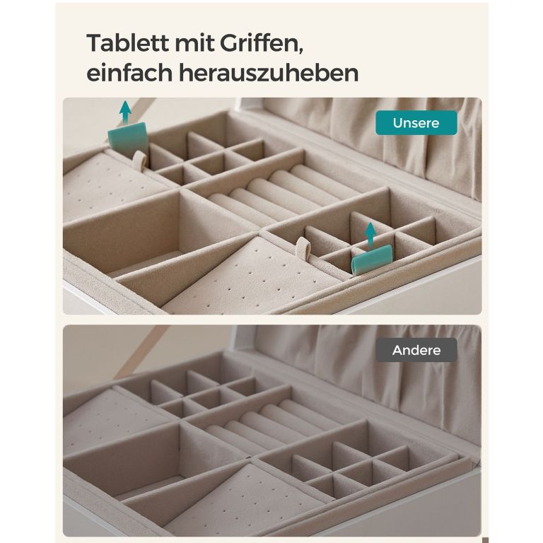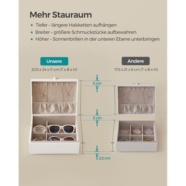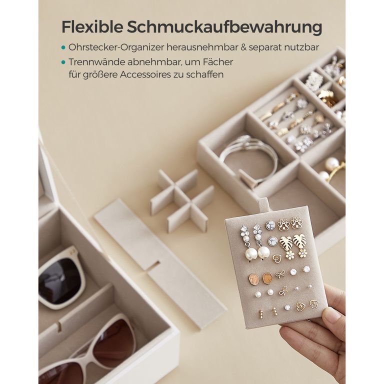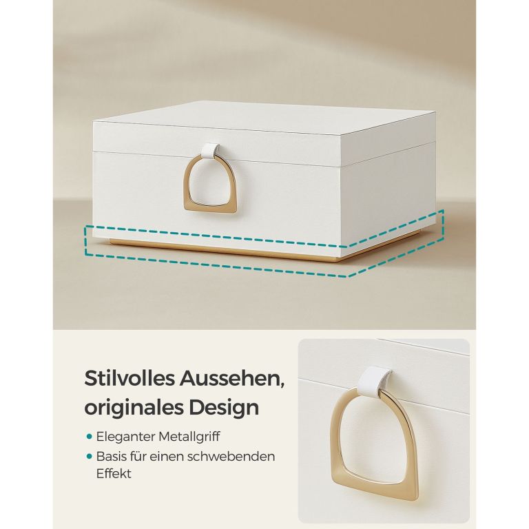 Podkreśl wyjątkowość swojej kolekcji biżuterii dzięki stylowej szkatułce SONGMICS w ponadczasowej bieli ze złotymi akcentami. Wyjątkowy design sprawia, że stanie się ozdobą każdej toaletki, a praktyczne rozwiązania pozwolą uporządkować zarówno pierścionki, kolczyki, jak i zegarki czy okulary. To idealny wybór na prezent dla bliskiej osoby lub dla siebie.