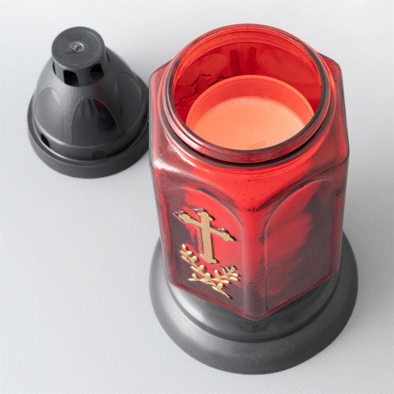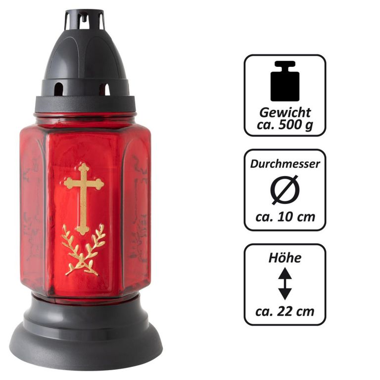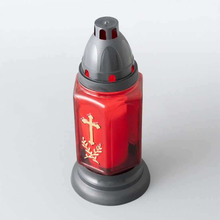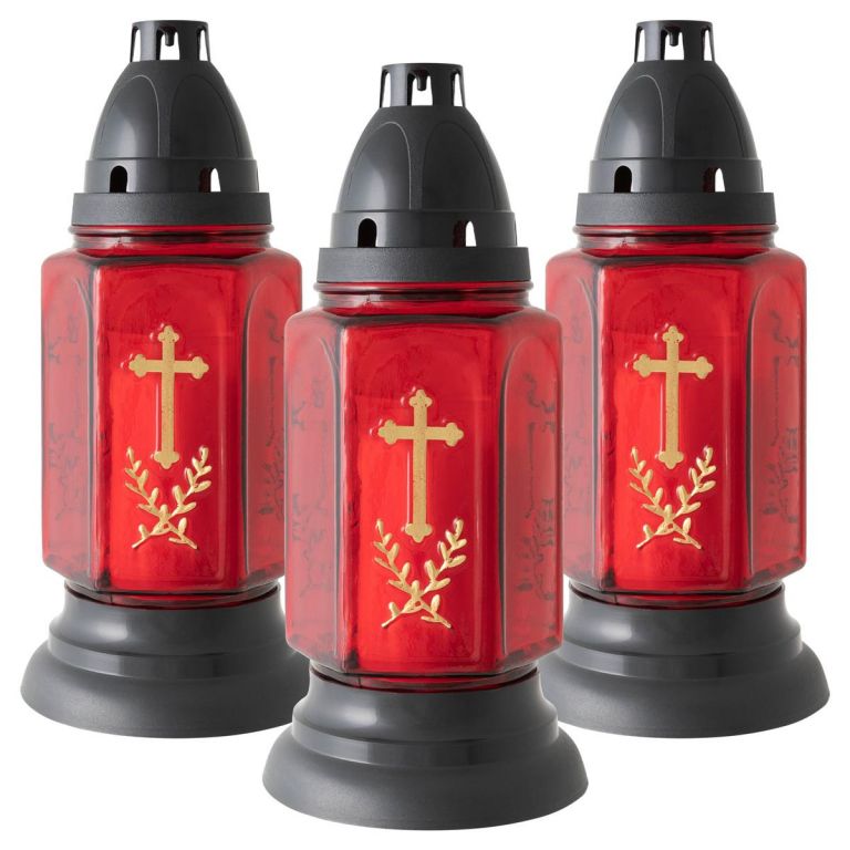 Szklany lampion na świecę, czerwony, złoty krzyż, 22 cm 3szt
