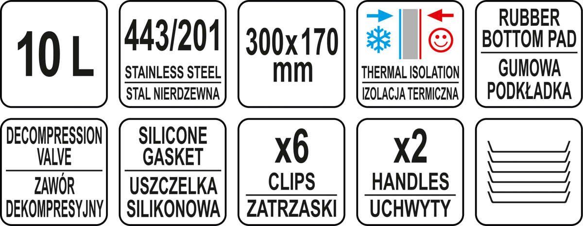 Termos wyposażony jest w dwa masywne uchwyty ze stali nierdzewnej ułatwiające transport oraz sześć zatyczek zamykających pokrywę. Wysoka jakość i trwałość tych elementów gwarantuje wiele lat bezawaryjnego użytkowania. Spód termosu YATO zabezpieczony jest gumową osłoną, która zapobiega przesuwaniu się termosu po podłożu podczas transportu.