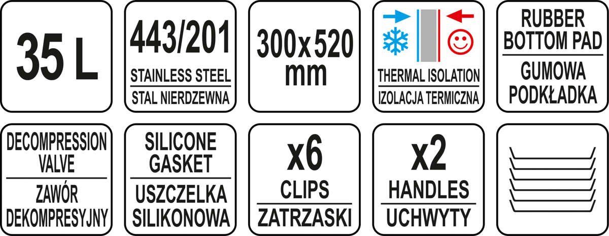 Termos wyposażony jest w dwa masywne uchwyty ze stali nierdzewnej ułatwiające transport oraz sześć zatyczek zamykających pokrywę. Wysoka jakość i trwałość tych elementów gwarantuje wiele lat bezawaryjnego użytkowania. Spód termosu YATO zabezpieczony jest gumową osłoną, która zapobiega przesuwaniu się termosu po podłożu podczas transportu.