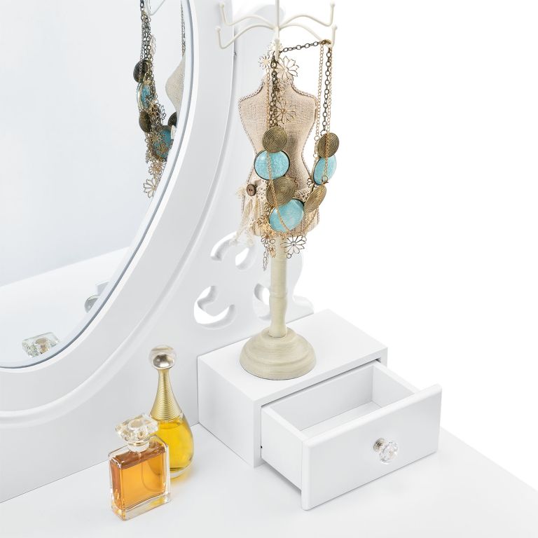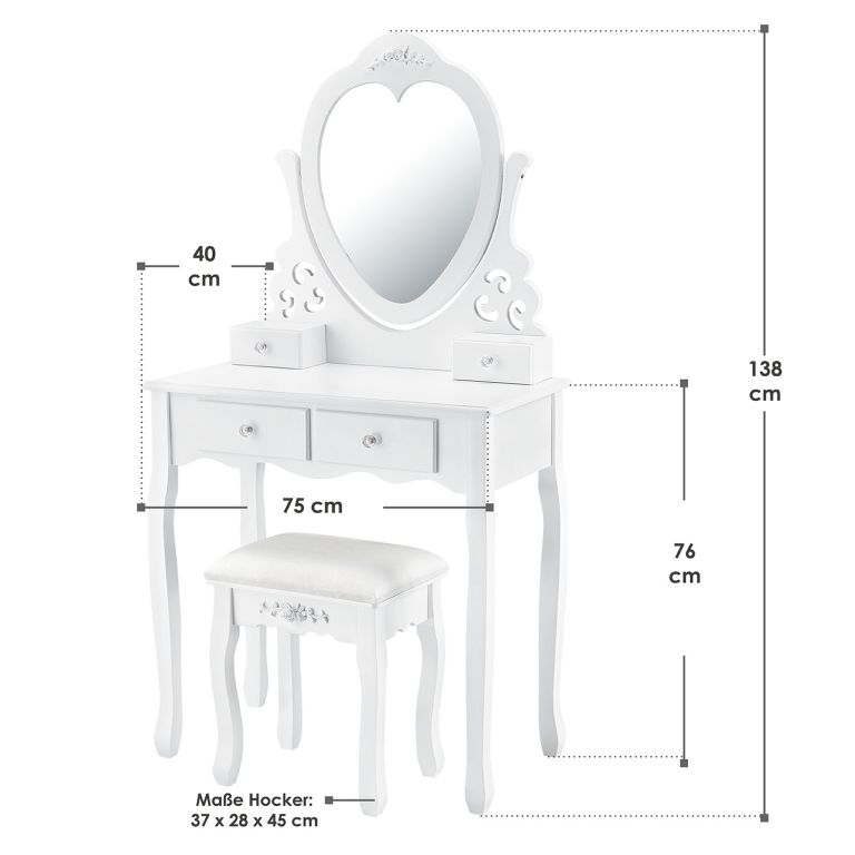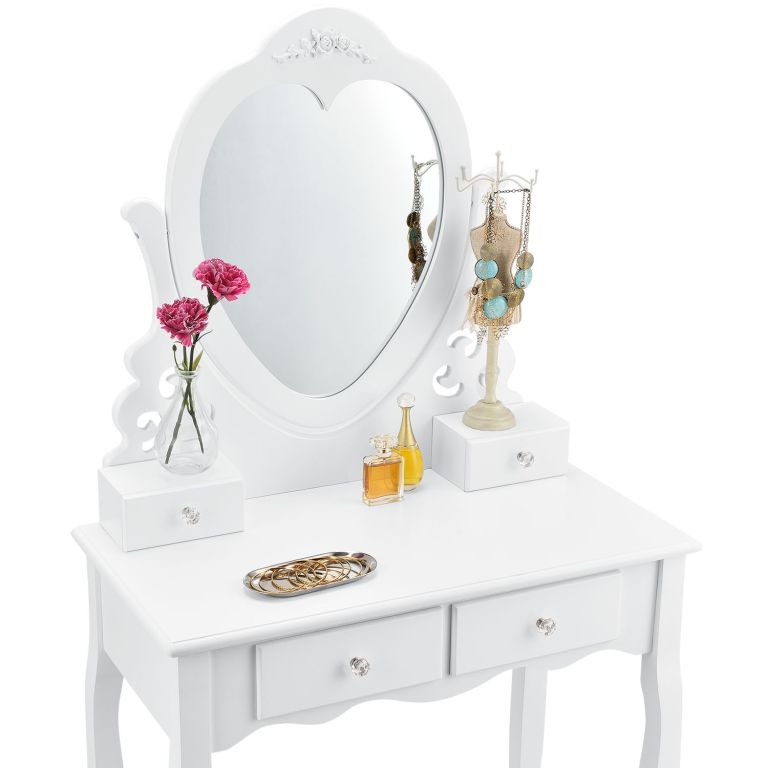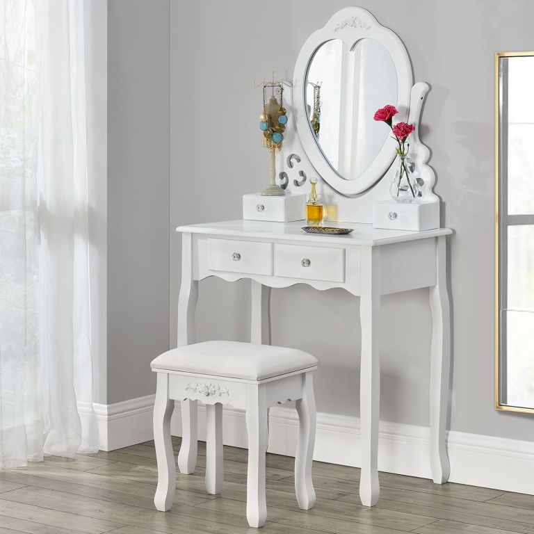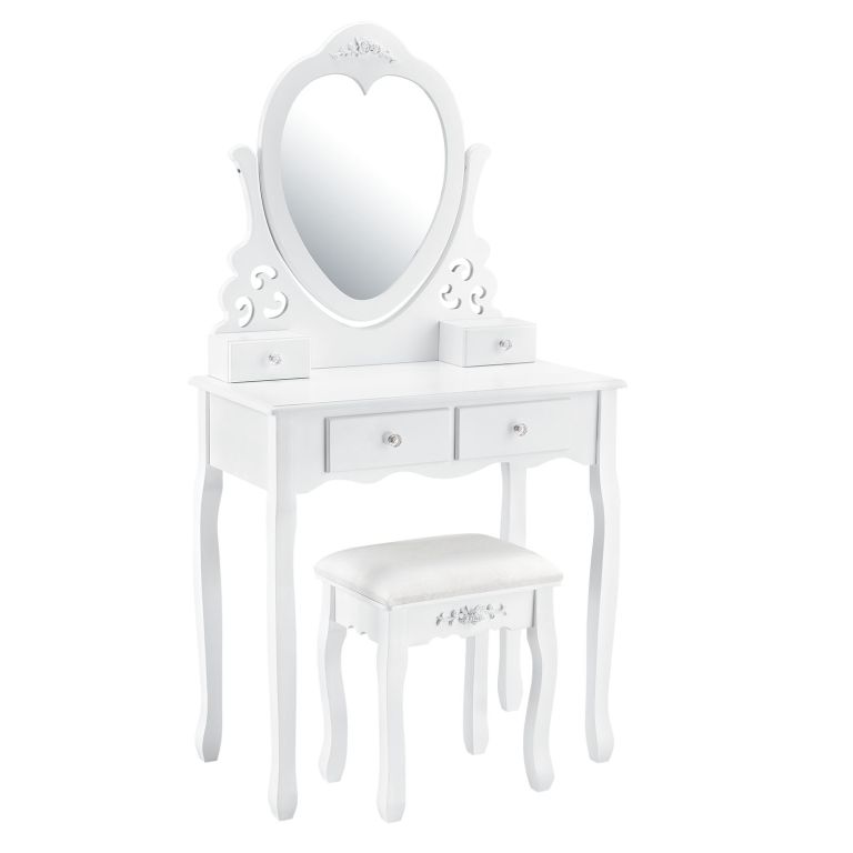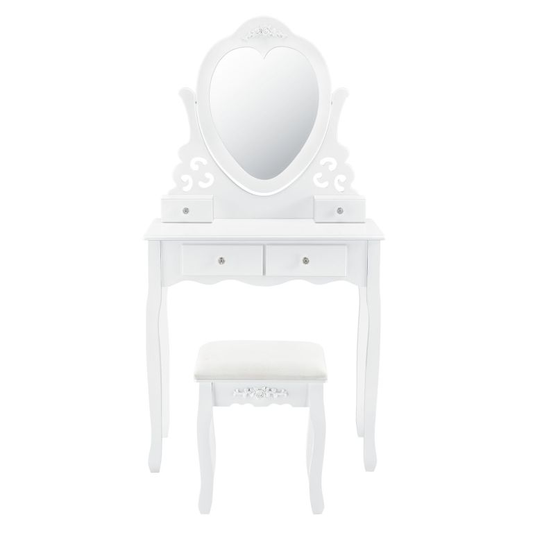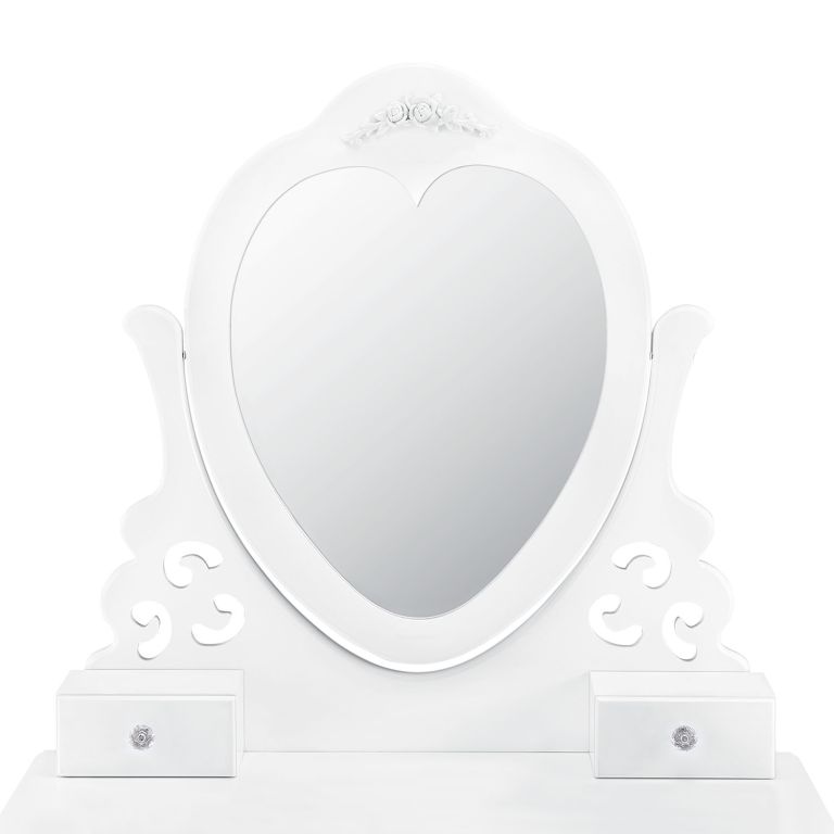 Podaruj sobie odrobinę luksusu dzięki toaletce Julia, która stanie się ozdobą każdej sypialni. Lustro w kształcie serca i miękki taboret zapewnią komfort podczas codziennej pielęgnacji.