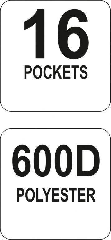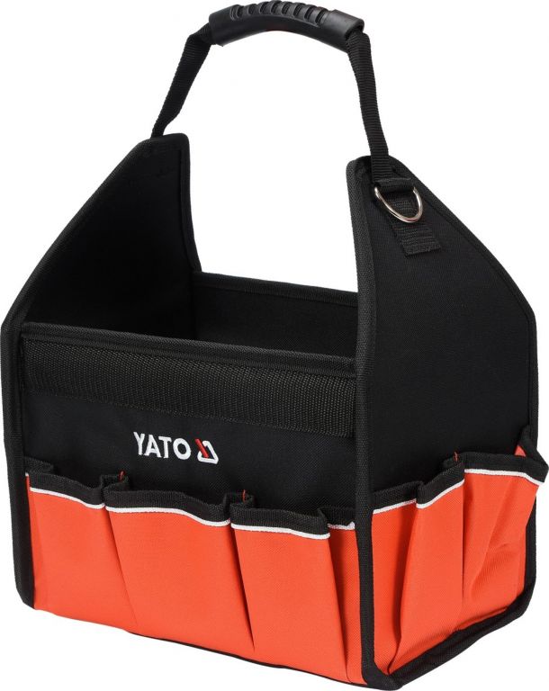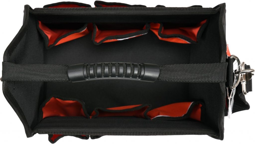 Praktyczna otwarta torba na narzędzia wykonana z wytrzymałego poliestru 600D ze wzmocnionym dnem odpornym na wilgoć.