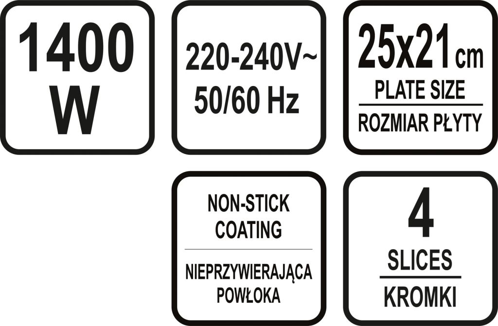 Toster do opiekania 4 tostów. Urządzenie wyposażone jest w nieprzywierającą powierzchnię, co ułatwia czyszczenie i zapewnia równomierne opiekanie. Zasilany napięciem 230V, z kablem o długości 0,7 m.