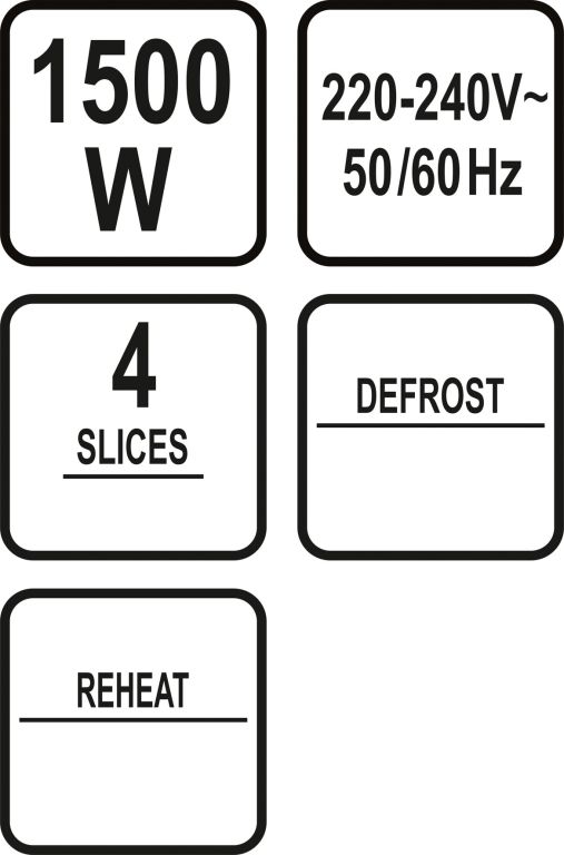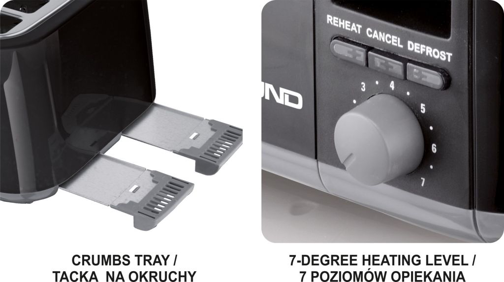 Toster do opiekania 4 kromek chleba. Aby zapewnić preferowany stopień opiekania, dostępnych jest siedem regulowanych poziomów mocy. W zestawie znajdują się dwie tacuszki na okruchy, które ułatwiają czyszczenie. Zasilany przez 230 V, kabel o długości 0,75 m, który można przechowywać wewnątrz tostera.