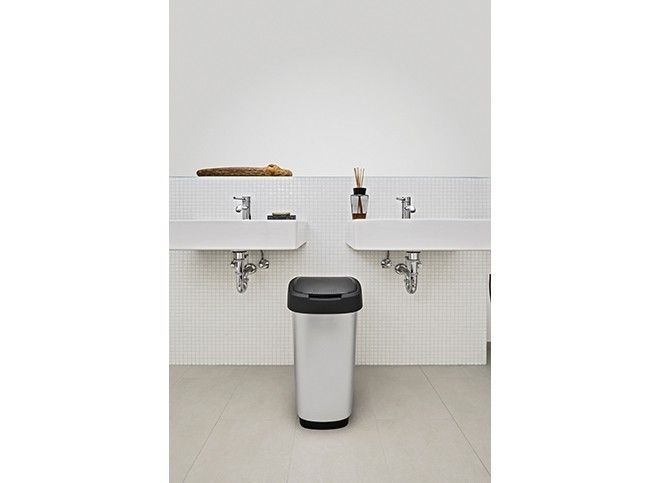 Metalowy kosz na śmieci z tworzywa sztucznego z pokrywą na zawiasach. Dwa sposoby na otwarcie kosza. Pojemność: 25 L. Wysokiej jakości materiał i design szwajcarskiej marki Rotho. Klasyczny i neutralny design pasuje do każdego wnętrza.