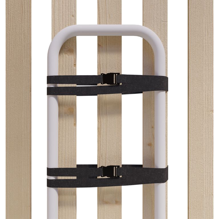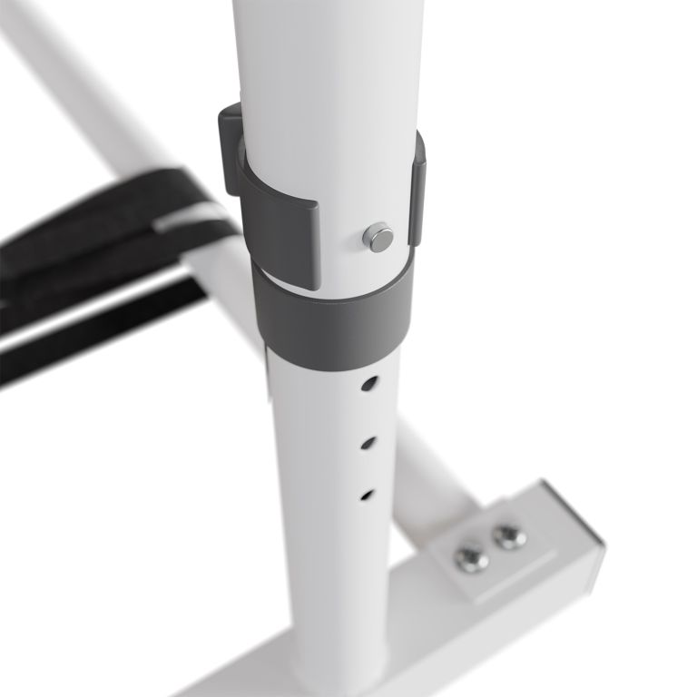 Wytrzymała stalowa konstrukcja gwarantuje niezawodność. Łatwy montaż z użyciem pasa zabezpieczającego pozwala szybko przygotować uchwyt do użycia. Regulowana wysokość umożliwia dostosowanie do indywidualnych potrzeb. Utrzymanie czystości jest bardzo proste.