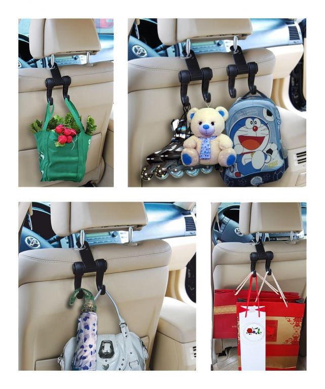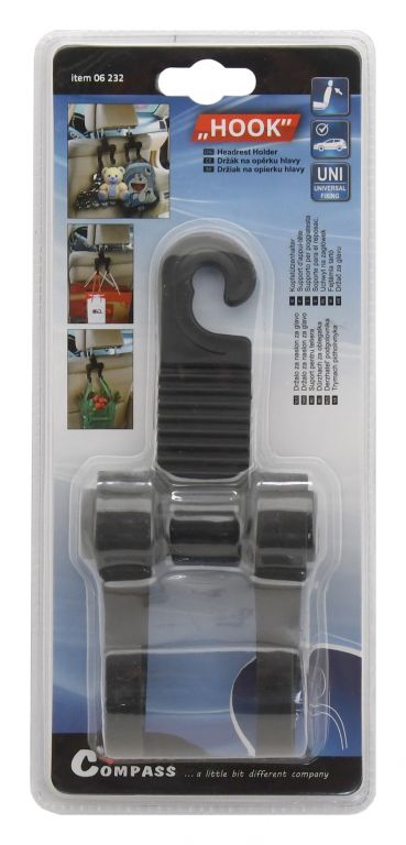 Praktyczny uchwyt do zawieszenia na zagłówku przednich siedzeń samochodu. Wyposażony jest w dwa haczyki, na których można zawiesić np. torbę na zakupy, ubrania, plecak itp. Posiada solidną konstrukcję nadwozia.