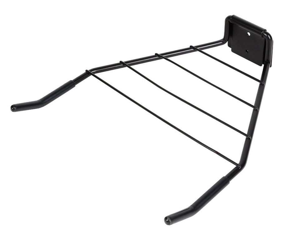 Składany uchwyt rowerowy z siatką na akcesoria, przeznaczony do montażu na ścianie. Metalowy uchwyt składa się z uchylnego podwójnego ramienia i kratki. Końce uchwytu są gumowane w celu bezpiecznego zamocowania ramy roweru, a na siatce można umieścić dodatkowe akcesoria takie jak kask, torba itp. Uchwyt montowany jest w ścianie za pomocą śrub i kołków.