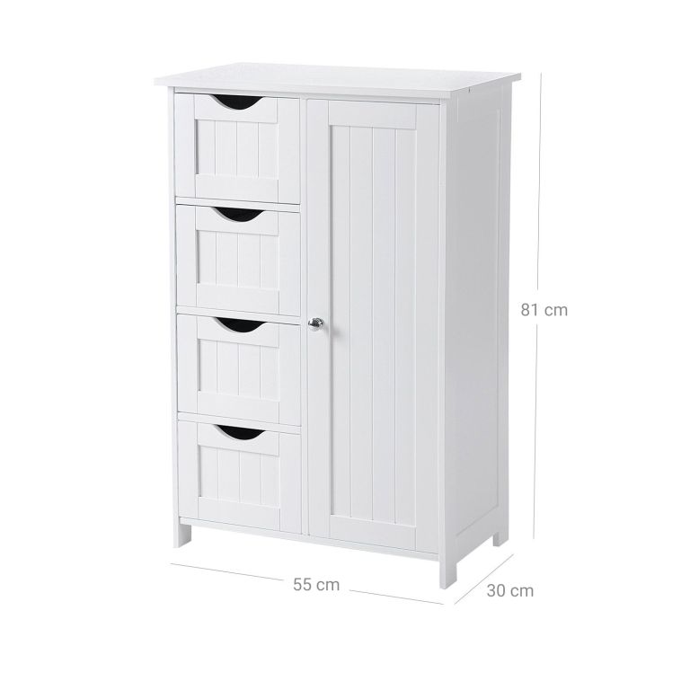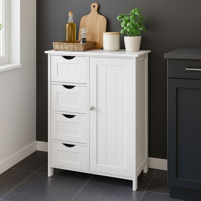 Uniwersalna biała szafka z 4 szufladami i regulowaną półką, idealna do kuchni i innych pomieszczeń.