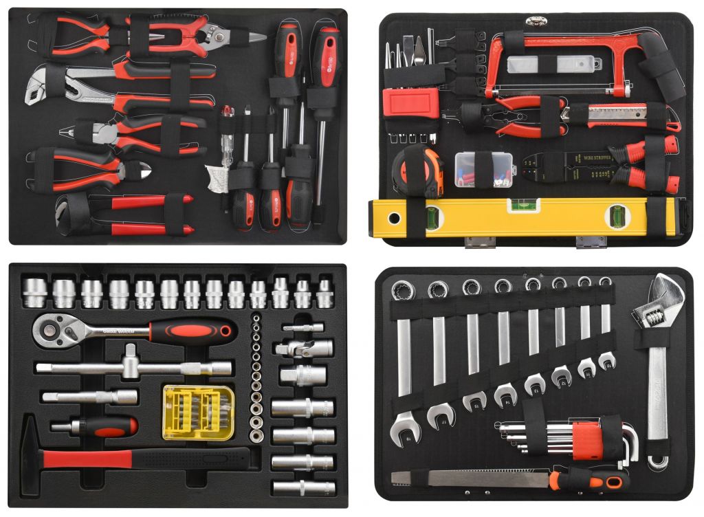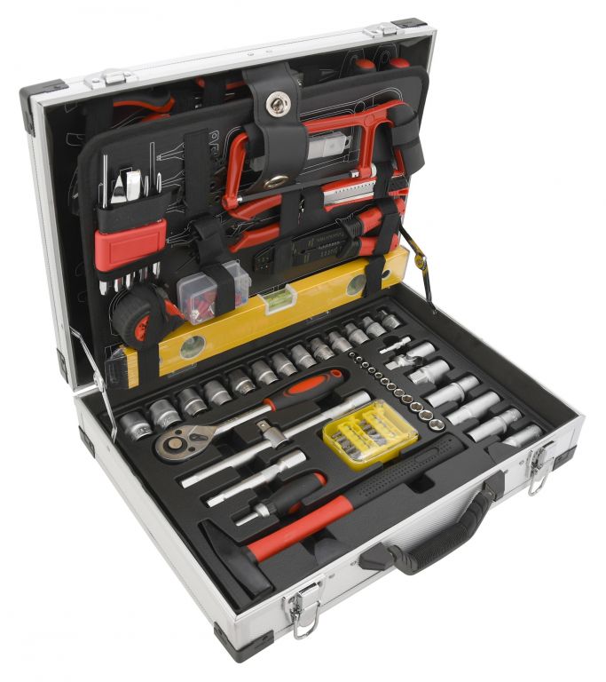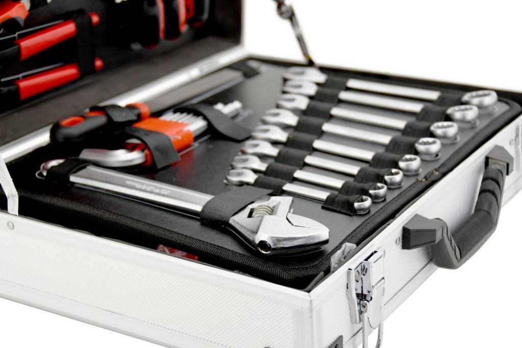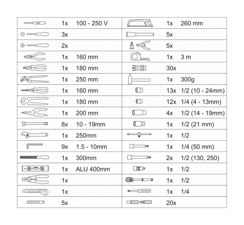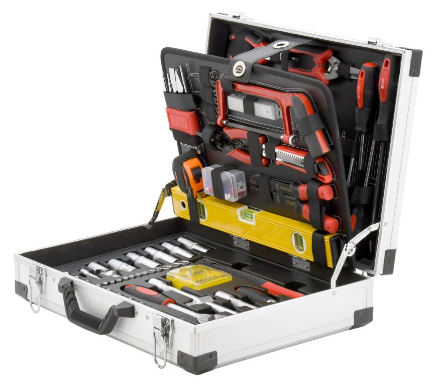 Przenośna walizka wyposażona w ekskluzywne narzędzia CR-V, w tym klucze płasko-oczkowe, poziomicę i inne narzędzia ułożone w ustalonych pozycjach w sumie 4 talerze. Dno walizki jest wyposażone we wkładkę zapadkową z mechanizmem 45 zębów oraz jej osprzęt i akcesoria, a także młotek i śrubokręt zapadkowy wraz z bitami. Górna część obudowy jest wyposażona w śrubokręty różnych rozmiarów, w tym tester dla elektryków. Ponadto najczęściej używane szczypce, w tym kombinowane, dzielenie i cięcie. Między dnem a górą znajduje się mocno włożona dwustronna płytka z kluczami kombinowanymi, kluczem nastawnym, pilnikiem i kluczem imbusowym z jednej strony. Z drugiej strony znajdują się poziomica, miernik, nóż z zapasowymi ostrzami, piła, stemple, szczypce do segerów i szczypce dla elektryków, w tym złącza.