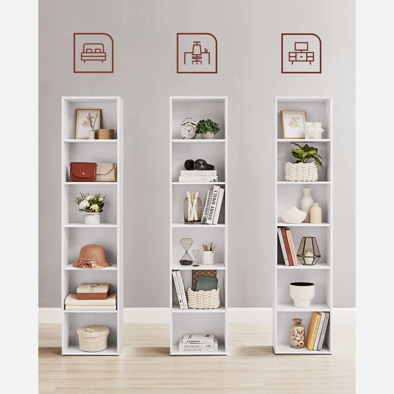 Stwórz przytulny kącik na książki, dekoracje lub rośliny dzięki temu wąskiemu regałowi w czystej bieli. Prosty skandynawski design pasuje do każdego wnętrza i pomaga utrzymać porządek oraz lekkość w domu.