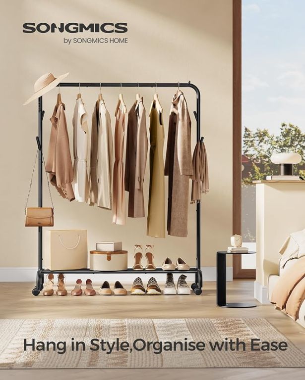 Odkryj wygodę codziennego użytkowania dzięki temu praktycznemu wieszakowi na ubrania. Uniwersalny design sprawdzi się w każdym wnętrzu, a duża nośność pozwala przechowywać nawet ciężkie płaszcze. Boczne haczyki i dolna półka zapewniają miejsce na dodatki i obuwie.